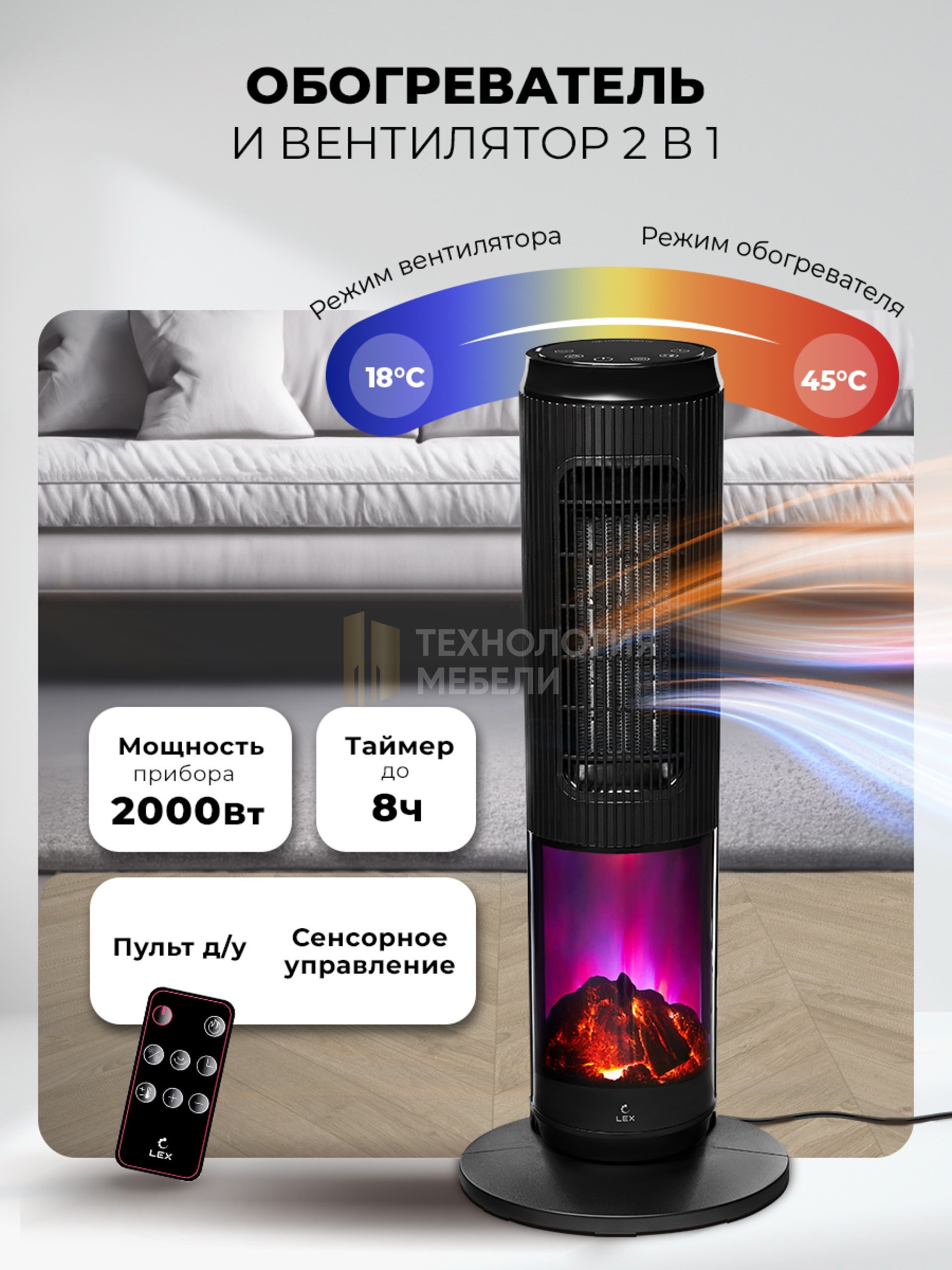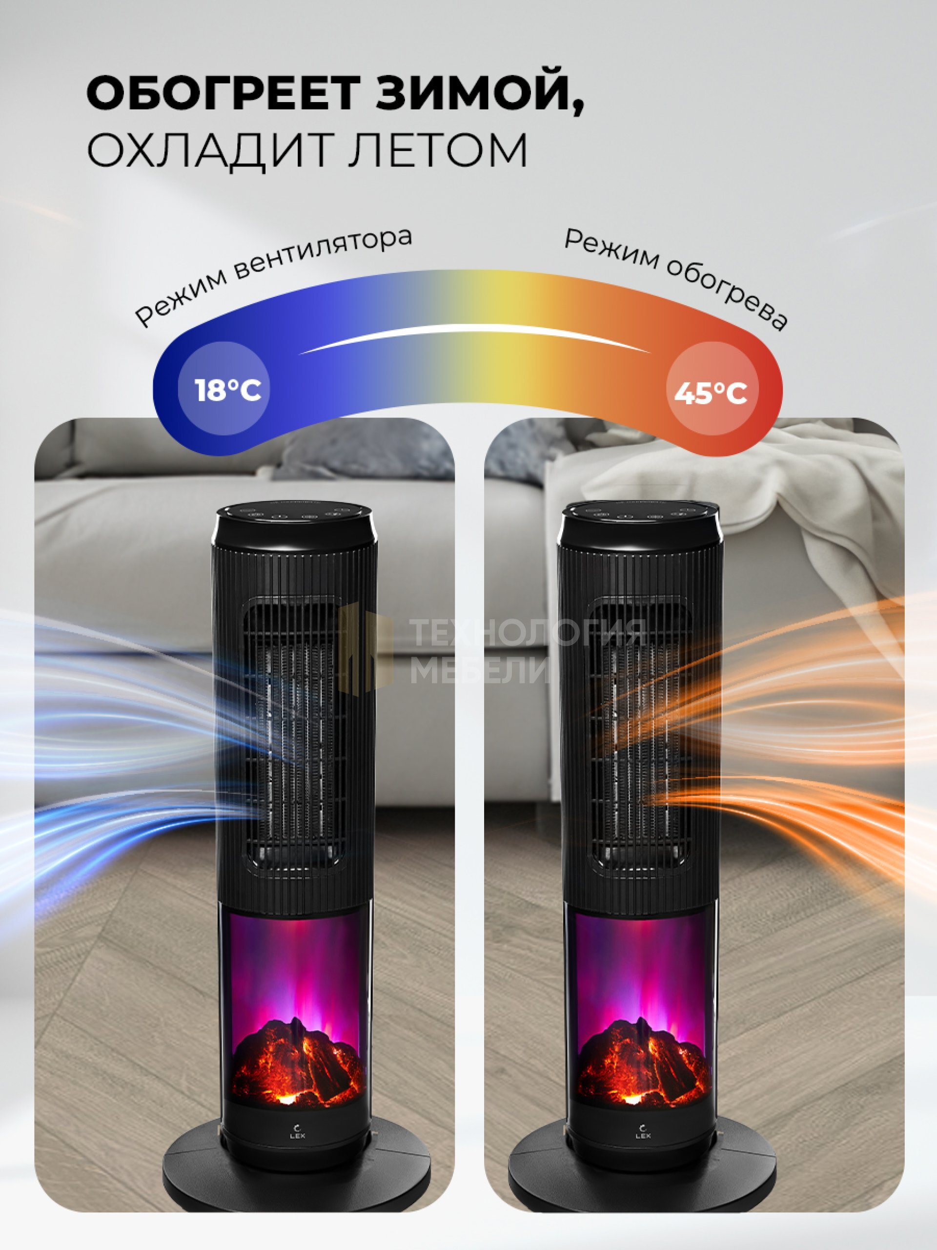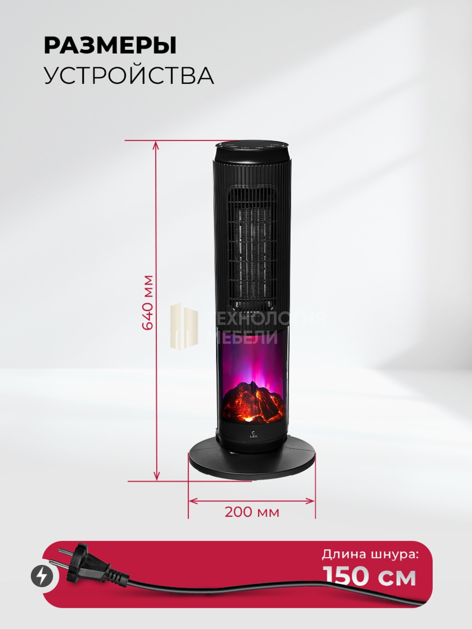 Тепловентилятор LEX LXCR 1526 мощностью 2000 Вт эффективно обогреет помещение площадью до 24 м². Современный дизайн с имитацией камина добавит уюта в ваш интерьер.