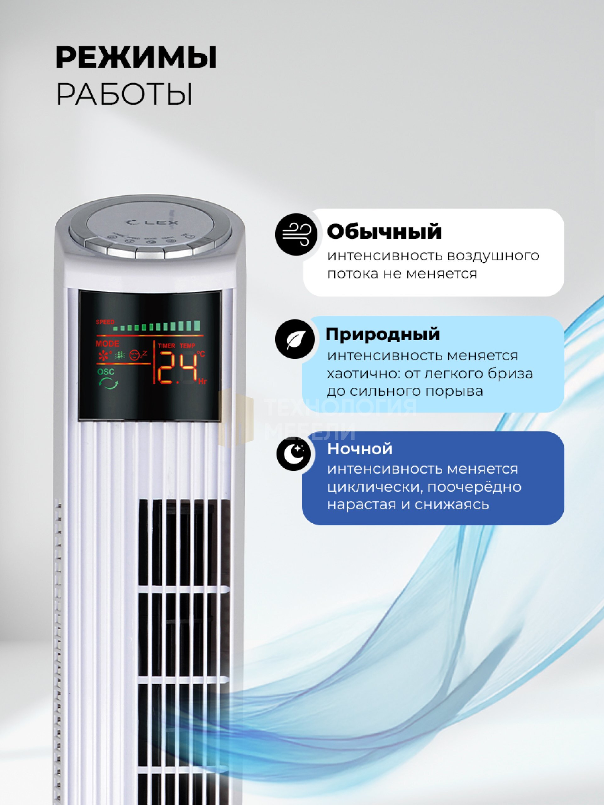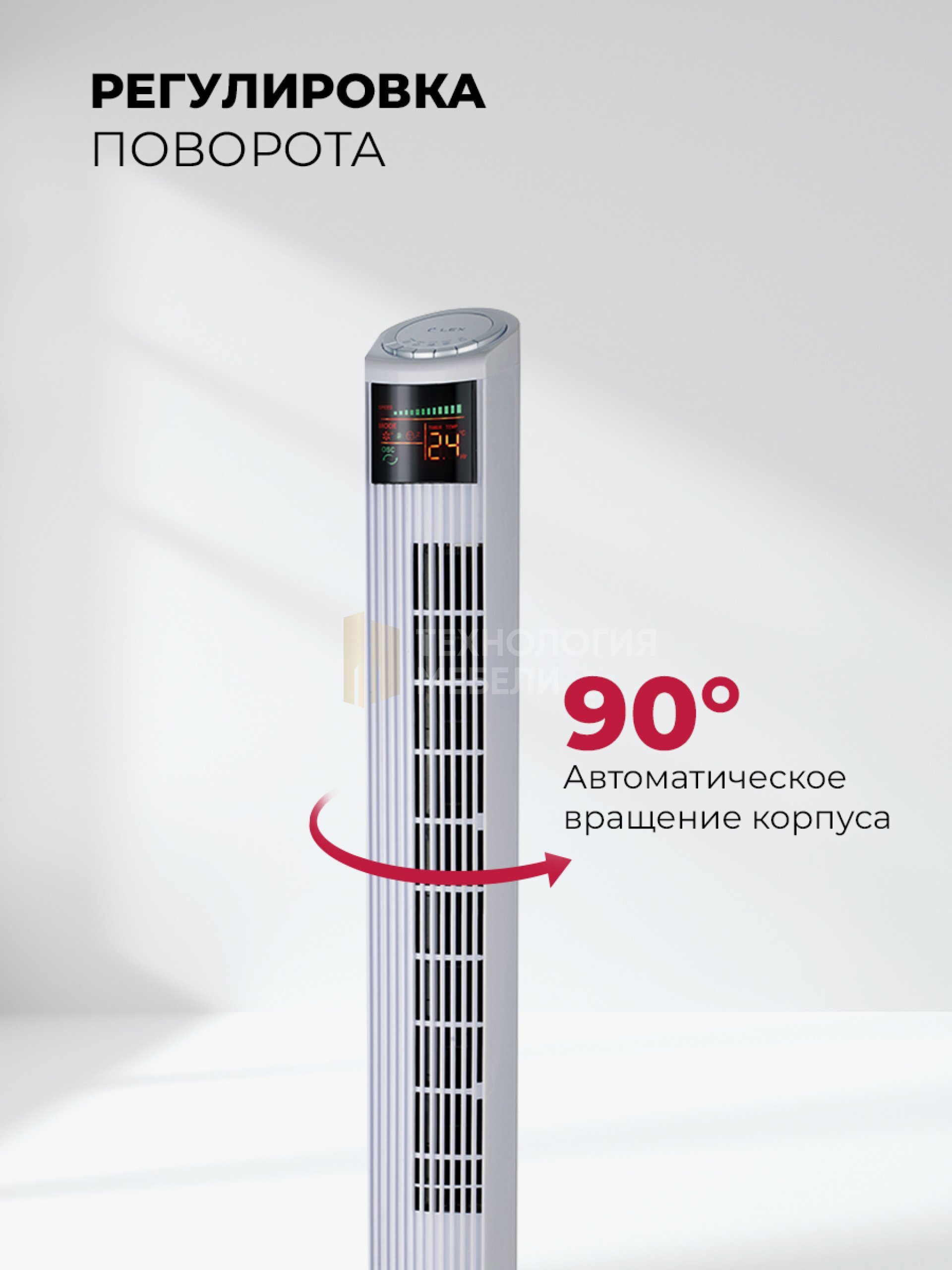 Таймер до 12 ч, 3 скорости потока воздуха и 3 режима работы. Вращение корпуса на 90 градусов позволяет более равномерно распределять воздушные потоки в помещении.