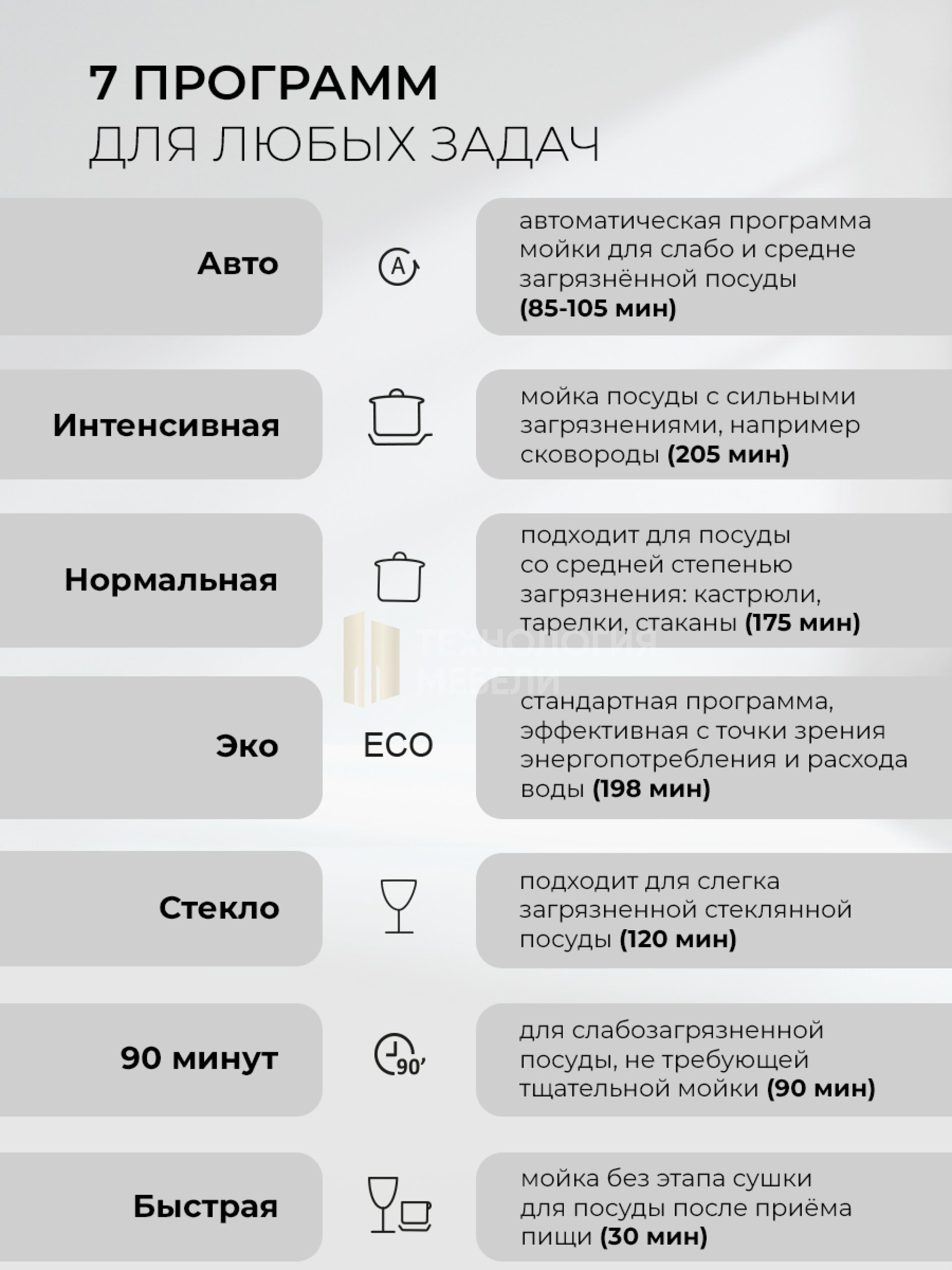 Одной из ключевых особенностей этой посудомоечной машины является возможность адаптировать циклы мытья к вашим потребностям и вашей посуде. Сюда входят: