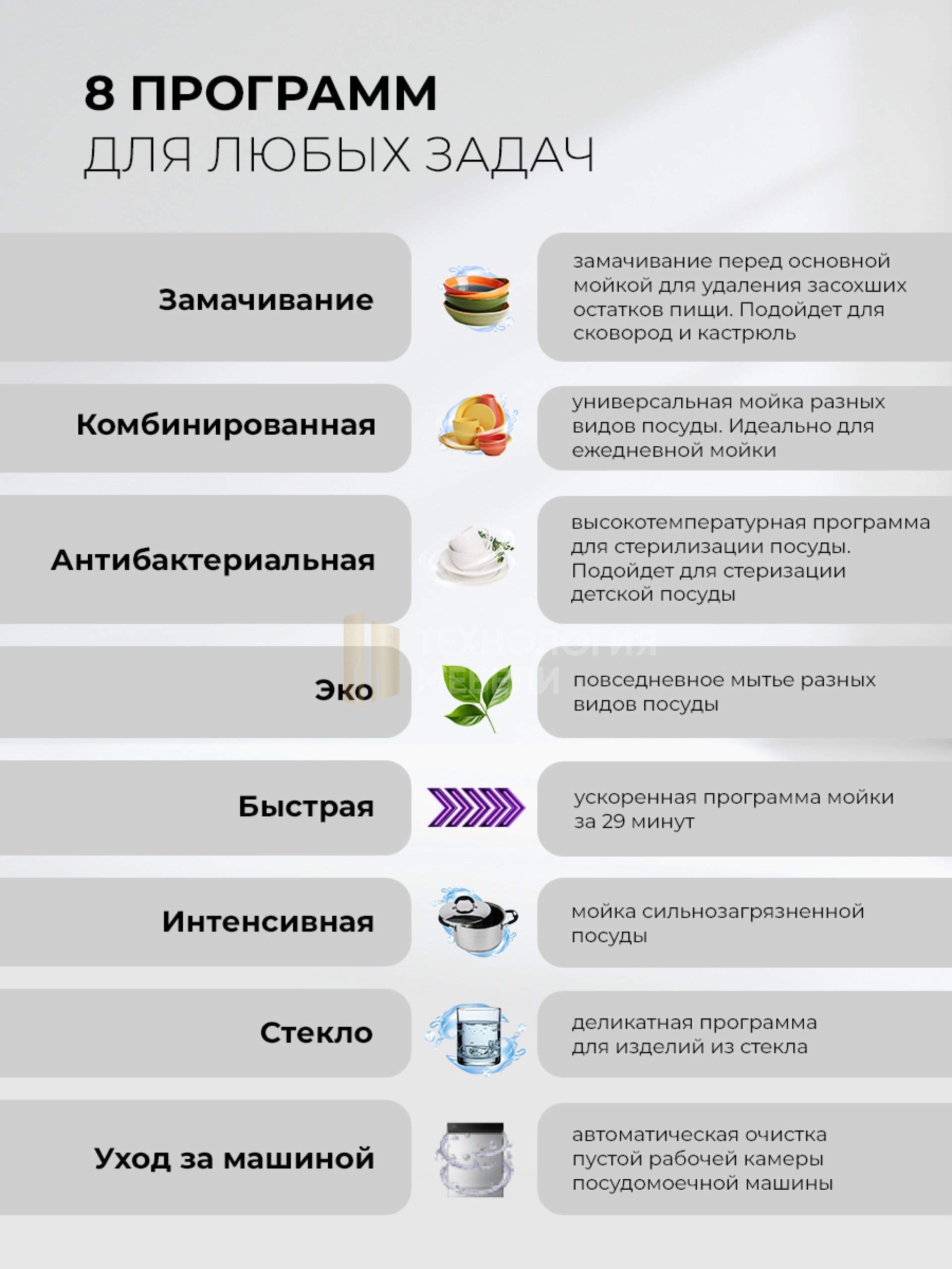 Восемь программ, включая быстрый и режим для стекла, позволяют добиться идеальной чистоты даже для деликатных бокалов. Сушка горячим воздухом ускоряем испарение влаги, сокращая время сушки и обеспечивает полное удаление капель воды, делая посуду идеально сухой. После сушки не остается разводов и белых следов от остатков соли.
