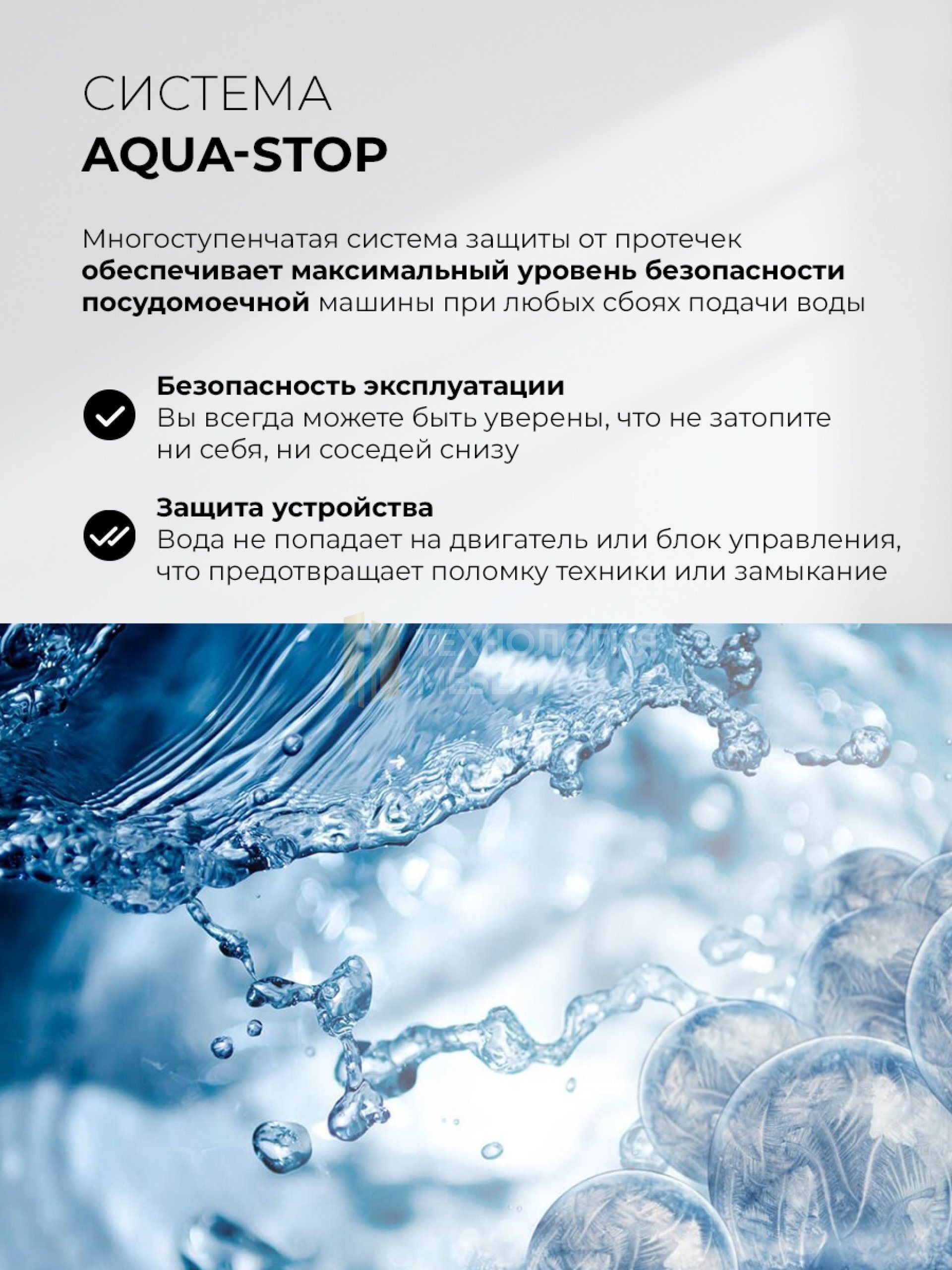Многоступенчатая система защиты от протечек Aqua-Stop — обеспечивает максимальный уровень безопасности посудомоечной машины при любых сбоях подачи воды. А обработка ультрафиолетом в конце цикла уничтожает известные вирусы и бактерии на 99%.