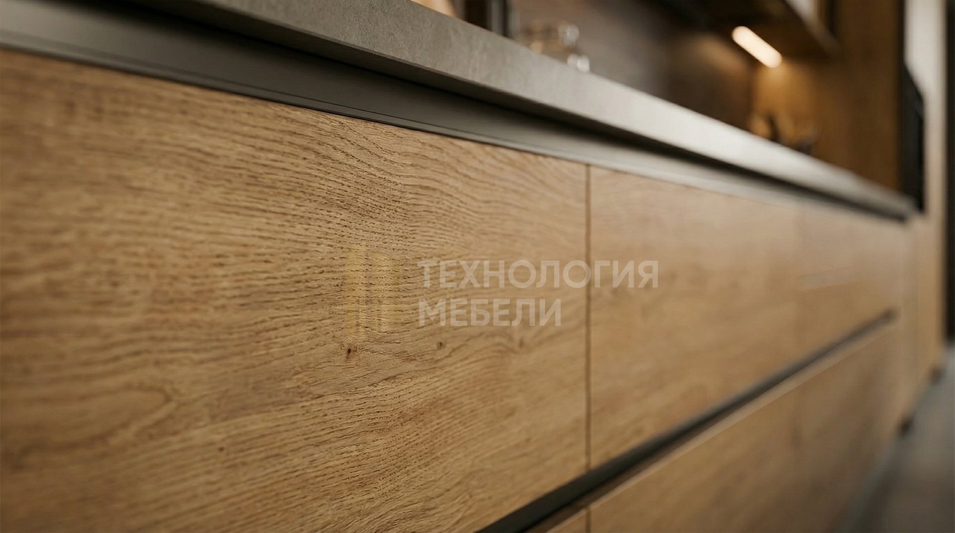 Кухня "Линия" воплощает чистый минимализм в прямой форме длиной 3.6 метра. Её фрезерованные фасады из стекла и ДСП в цвете Дуб Галифакс имеют фактуру Soft-touch. Интегрированный профиль Gola подчеркивает безупречные линии. Глянцевая столешница из HPL-пластика в цвете Бетон гармонирует с фартуком из керамогранита в оттенке Тёмный орех. Прочный корпус из металла и ДСП оформлен в цвете Дуб вотан. Пространство включает выдвижные ящики и открытые полки; верхние модули стандартной высоты. Кухонный остров отсутствует. Для акцентного освещения предусмотрена светодиодная лента, при этом подсветка рабочей зоны не используется.