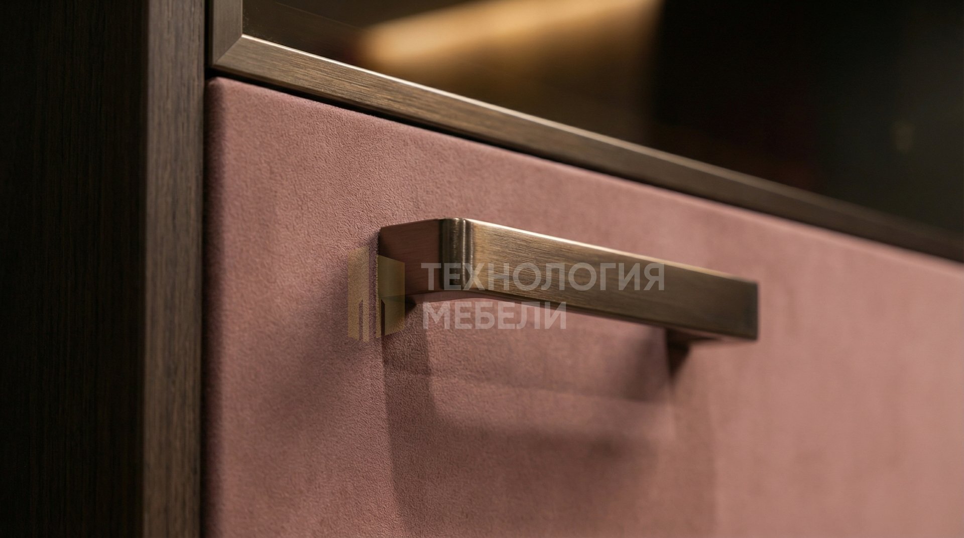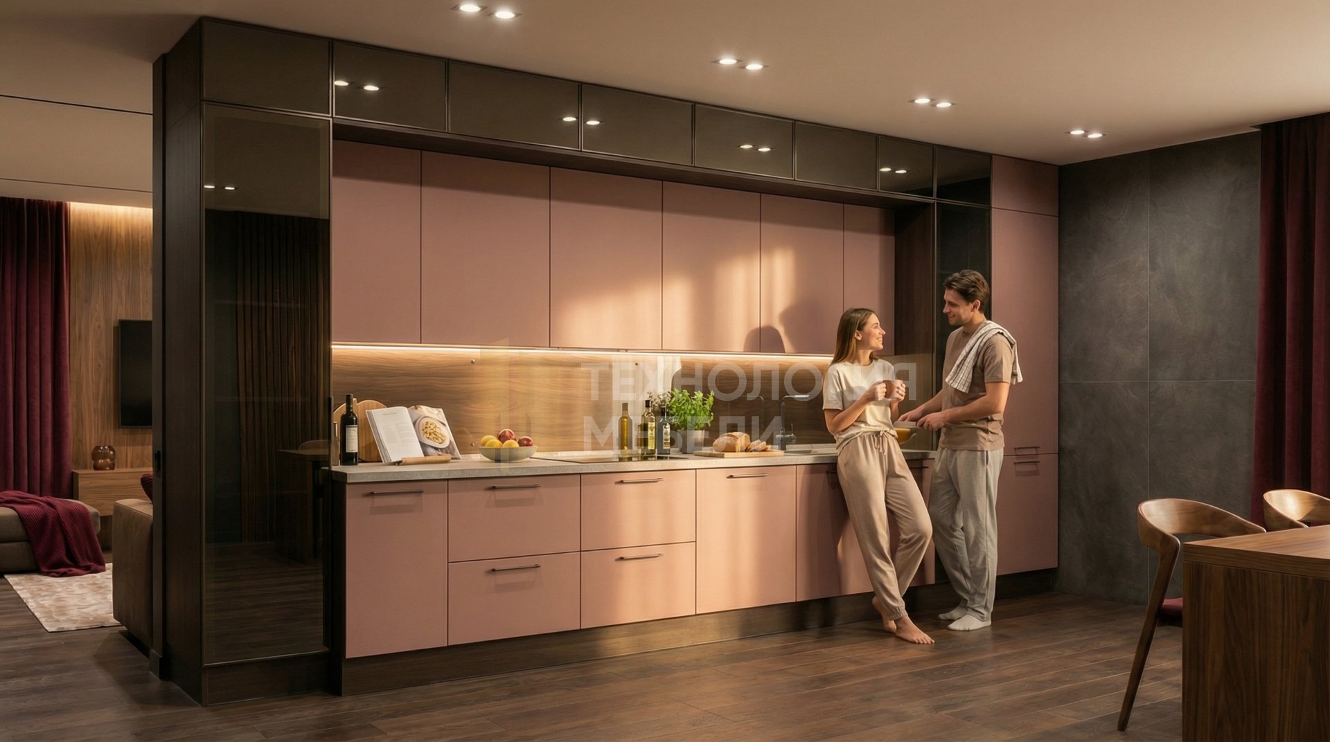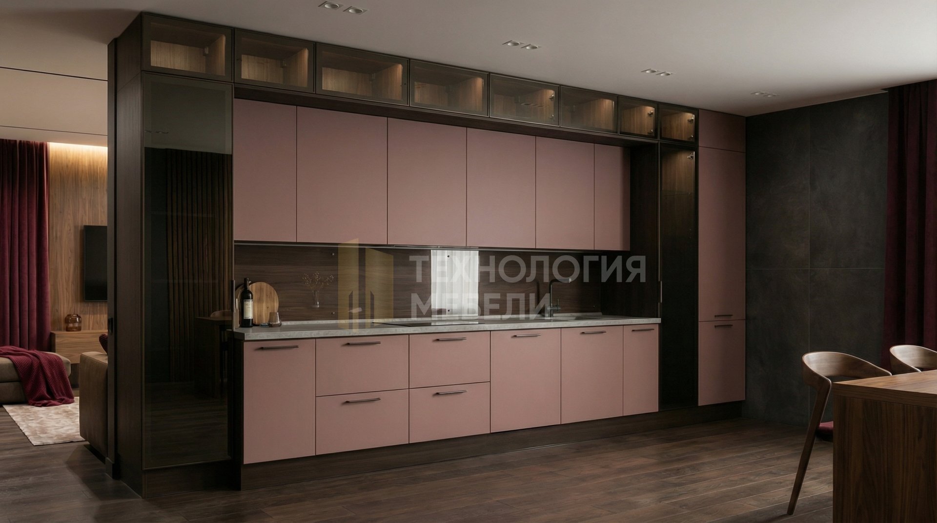 Кухня «Лунария» – это воплощение современного встроенного стиля длиной 3.0 м. Корпус из МДФ в тёмно-коричневом цвете сочетается с гладкими плоскими фасадами оттенка пыльной розы, выполненными из зеркала графит/бронза. Фартук из закаленного стекла тёмного ореха дополняет светло-серую текстурированную компакт-плиту столешницу. В конструкции применены ДСП, ЛДСП, металл, стекло, керамогранит. Накладные ручки и интегрированный профиль обеспечивают удобство открывания. Верхние модули стандартной высоты, открытые полки отсутствуют. Форма кухни предусматривает остров, но в данной комплектации не включен. Освещение представлено точечными светильниками. Палитра включает красный бордовый, светлый камень, серо-тёмный и тёплый орех, создавая изысканный и функциональный кухонный ансамбль.