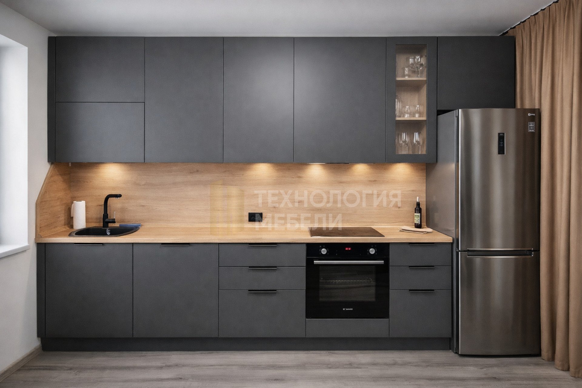 Кухня «Магнит» Модель «Магнит» — это современная линейная кухня в актуальном сочетании графитовых фасадов и тёплой древесной текстуры. Контраст матовой тёмной поверхности и светлой столешницы создаёт выразительный, но сдержанный образ, который легко интегрируется в городской интерьер. Дизайн и архитектура формы Кухня выполнена в строгой горизонтальной композиции. Верхние модули образуют цельную линию, визуально расширяя пространство. Минималистичные фасады без лишнего декора подчёркивают современный характер модели, а витрина со стеклянной вставкой добавляет лёгкости и визуального акцента. Тёплая текстура рабочей поверхности и фартука смягчает графитовую гамму, делая интерьер более уютным и «живым». Планировка и функциональность Линейная конфигурация делает «Магнит» оптимальным решением для квартир-студий и компактных кухонь. Рационально организованы ключевые зоны: мойка с удобным доступом к рабочей поверхности варочная панель и духовой шкаф в едином блоке вместительные выдвижные ящики для хранения верхние модули увеличенной высоты Подсветка рабочей зоны обеспечивает комфорт при приготовлении и подчёркивает текстуру материалов. Материалы и комплектация Износостойкие матовые фасады Практичная столешница с высокой устойчивостью к влаге и механическим нагрузкам Надёжная фурнитура с плавным ходом Возможность интеграции современной техники Каждый проект адаптируется под размеры помещения и пожелания заказчика: цвет фасадов, конфигурация модулей, тип фурнитуры и наполнение ящиков подбираются индивидуально. Преимущества модели «Магнит» современная эстетика без визуального шума удобная организация хранения универсальное цветовое решение баланс практичности и стиля «Магнит» — функциональная кухня с характером, созданная для комфортной ежедневной эксплуатации и современного ритма жизни.
