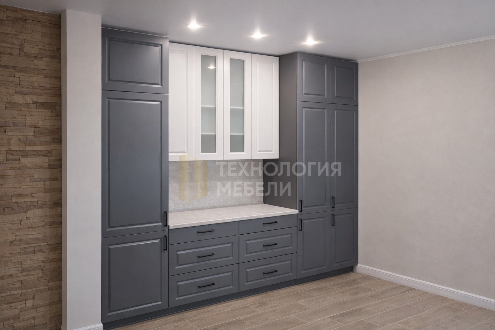 Кухонная композиция в стиле неоклассика. Кухня Марианна. Эта модель — выразительное сочетание строгой архитектуры форм и современной цветовой палитры. Контраст белых верхних фасадов со стеклянными вставками и глубокого графитового оттенка нижних и боковых модулей создаёт сбалансированную, статусную композицию. Фасады выполнены в рамочном исполнении с аккуратной фрезеровкой, что подчёркивает неоклассический характер кухни. Высокие пеналы формируют цельный встроенный блок и визуально «собирают» пространство, добавляя интерьеру аккуратности и завершённости. Центральная рабочая зона выделена светлой столешницей и лаконичным фартуком нейтральной текстуры. Такое решение усиливает ощущение глубины и делает композицию лёгкой, несмотря на насыщенный оттенок графитовых фасадов. Продуманная система хранения включает: вместительные нижние выдвижные ящики высокие пеналы для интеграции техники и хранения навесные шкафы со стеклянными фасадами эргономичную рабочую поверхность Модель подойдёт для современных интерьеров, где важны чёткая геометрия, функциональность и выразительный, но сдержанный дизайн. Эта кухня — пример того, как классическая рамка фасада может выглядеть актуально и технологично в современной интерпретации.
