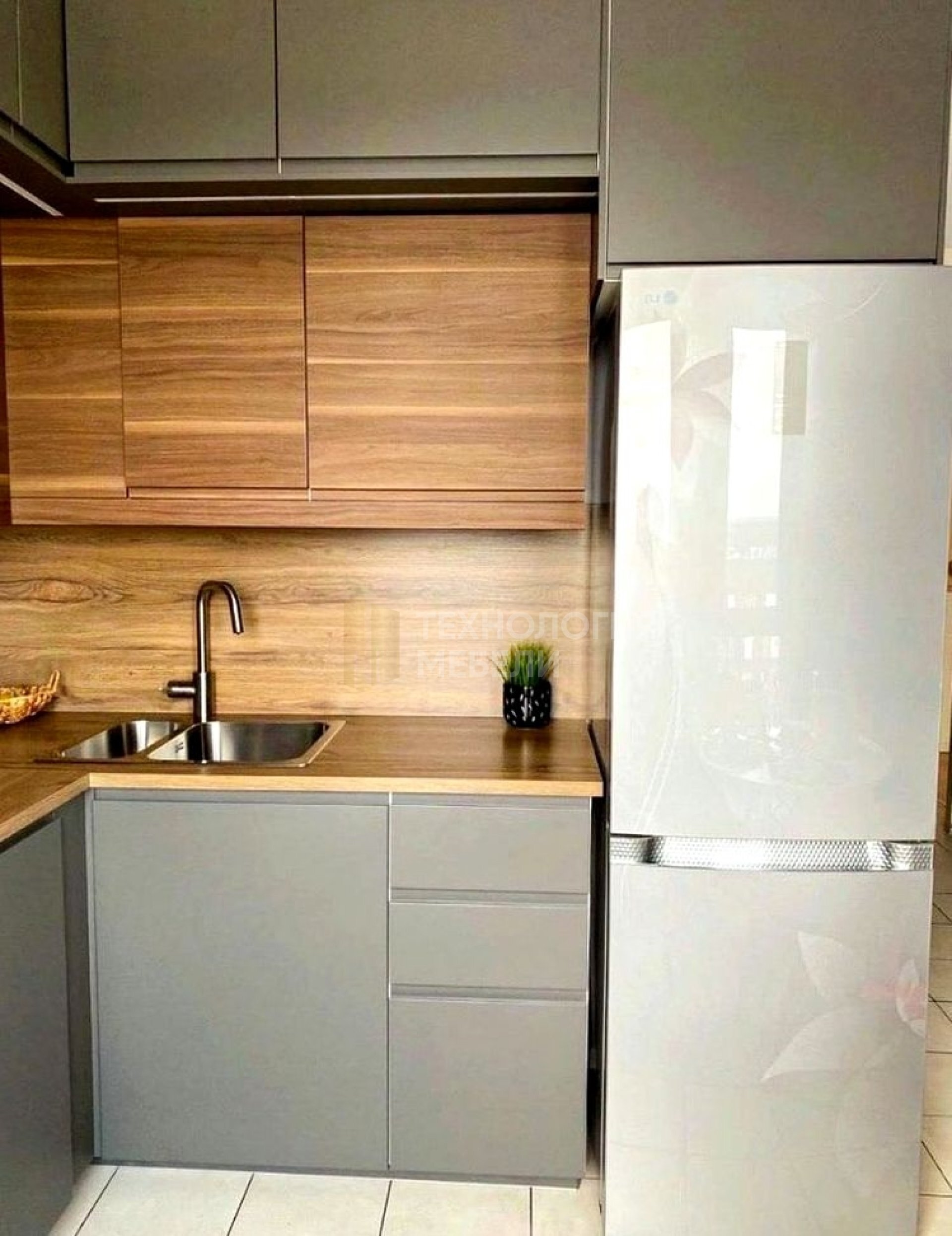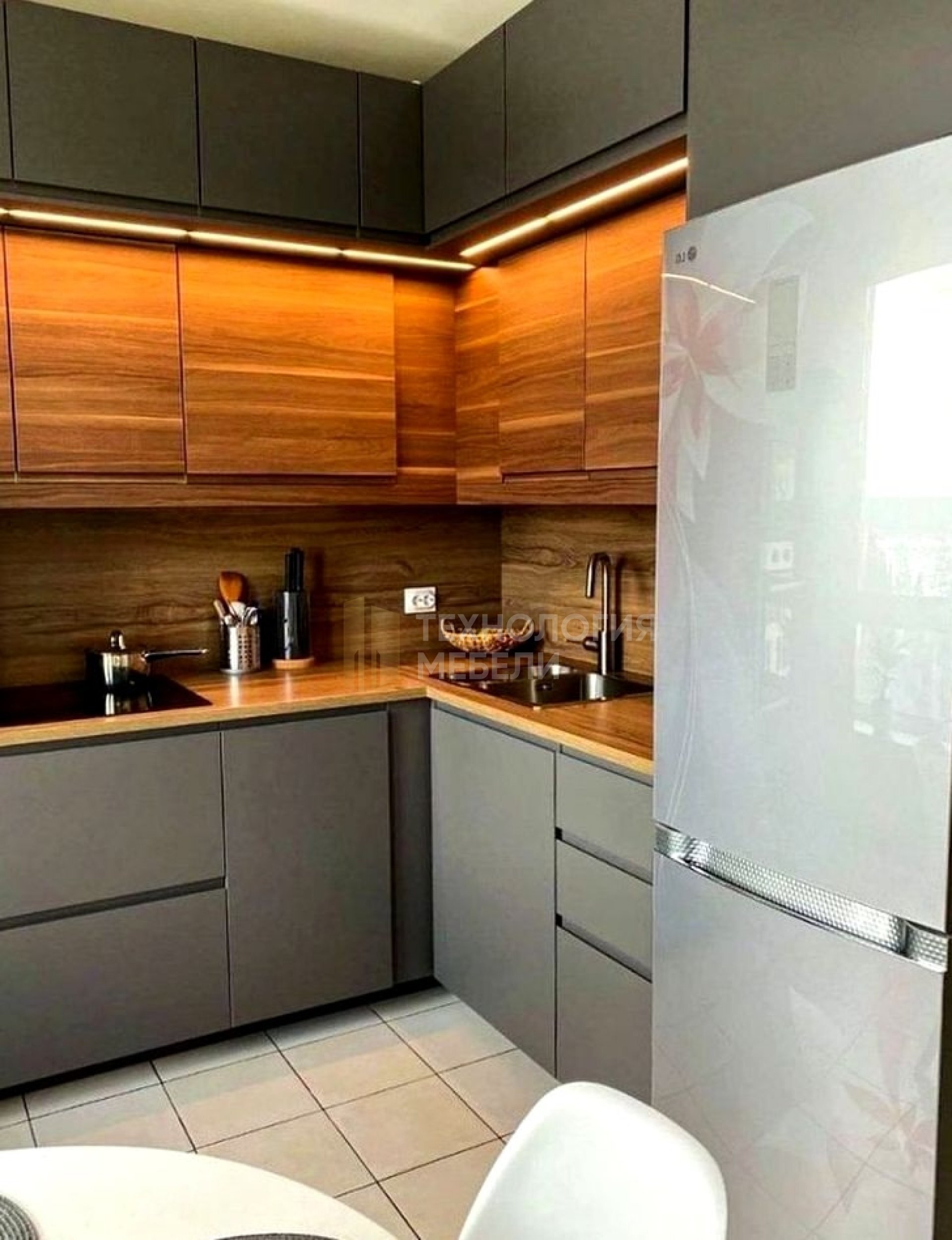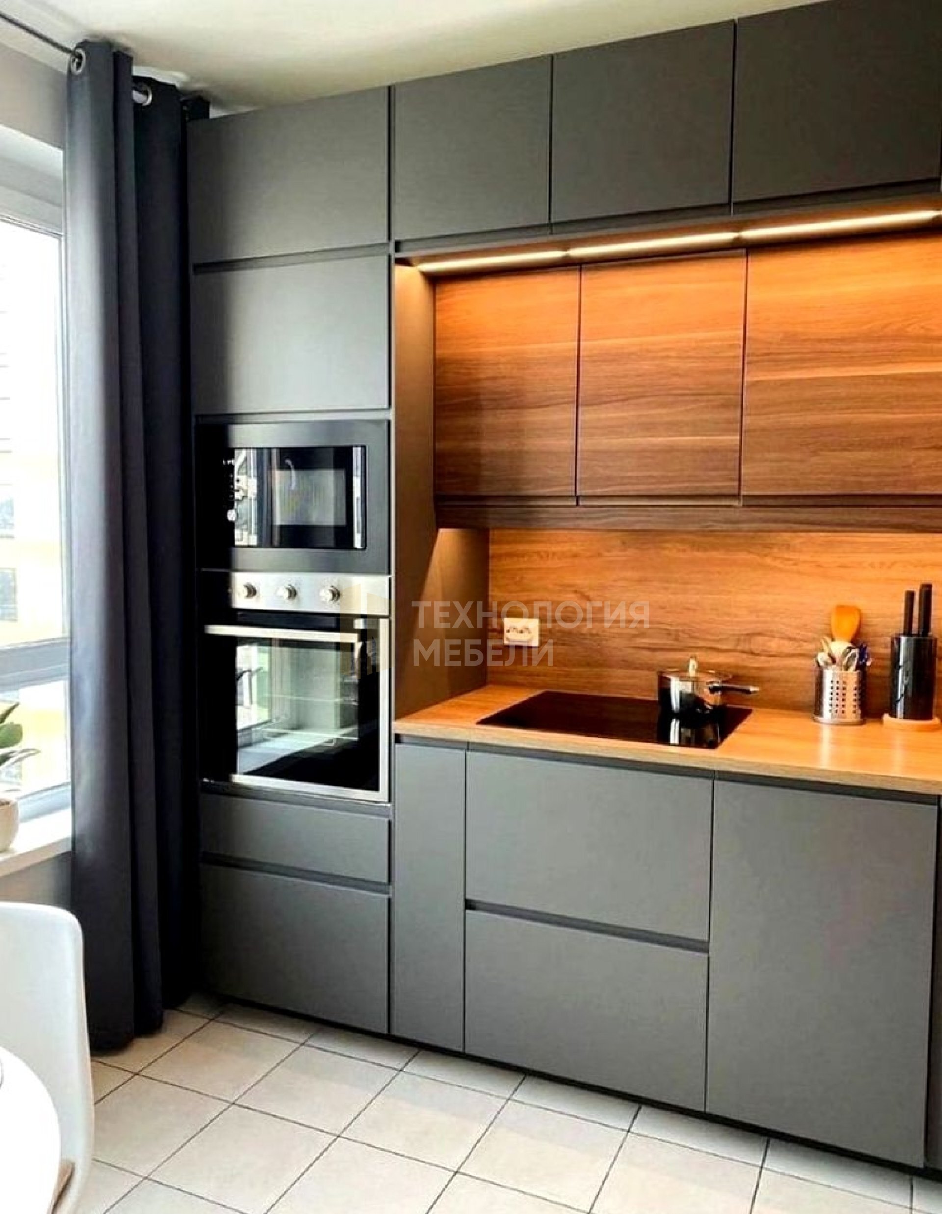 Современный кухонный гарнитур Марио – это элегантное решение для организации пространства на вашей кухне. На фотографии представлен лаконичный дизайн, сочетающий в себе строгие геометрические формы и благородную цветовую гамму. Преобладающий графитовый оттенок фасадов придает кухне солидность и современный вид, а вставки из светлого дерева добавляют тепла и уюта, создавая приятный контраст. Горизонтальная текстура деревянных элементов визуально расширяет пространство и подчеркивает естественную красоту материала. Подсветка рабочей зоны не только обеспечивает функциональность, но и создает атмосферу комфорта и гостеприимства. Кухня выполнена в стиле минимализм, где каждая деталь продумана и функциональна. Отсутствие лишних декоративных элементов и четкие линии подчеркивают современный характер гарнитура. Такой кухонный гарнитур станет идеальным выбором для тех, кто ценит практичность, стиль и комфорт. Изделия, подобные этому, создаются на заводе «Технология мебели» в Санкт-Петербурге, где применяются современные технологии и строгий контроль качества. Кухня Марио – это не просто мебель, это продуманное решение для создания функционального и стильного интерьера, который будет радовать вас долгие годы. Гарнитур отлично подойдет как для небольших, так и для просторных кухонь, позволяя максимально эффективно использовать доступное пространство. Светлые столешницы и фасады нижних шкафов гармонично сочетаются с темными верхними элементами.