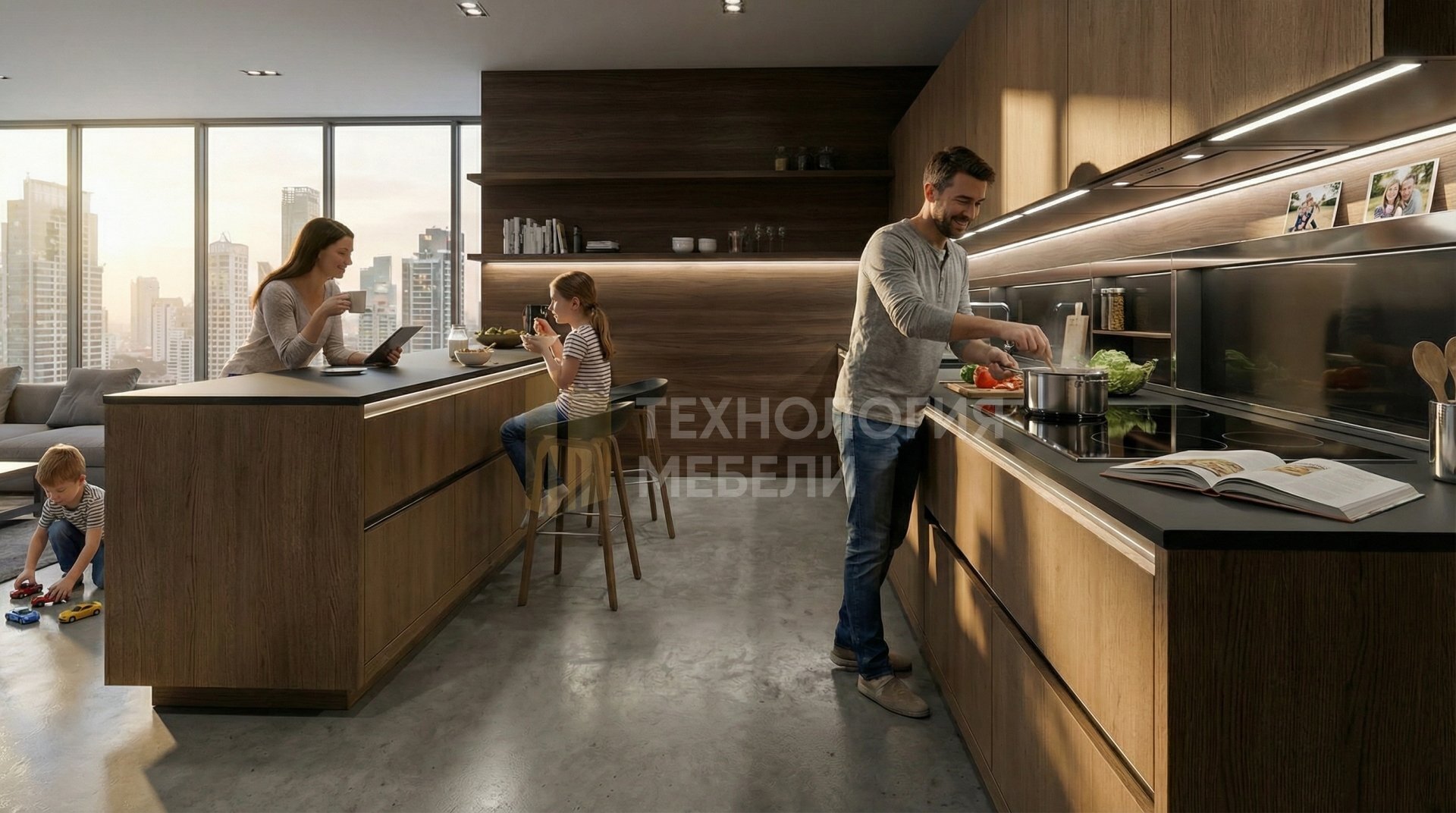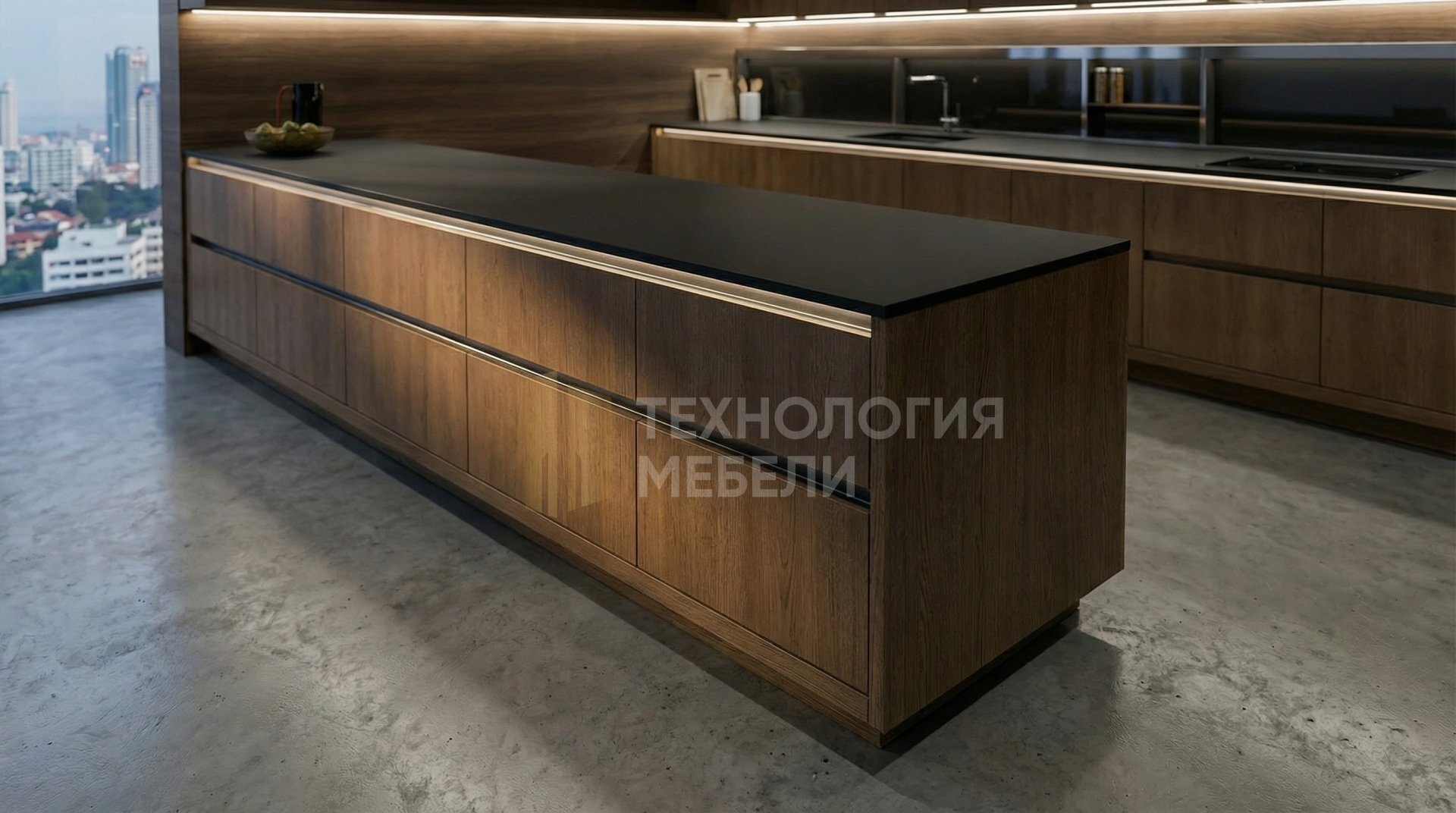 Представляем кухню "НеоЛайн" – воплощение современного стиля хай-тек. Двухрядная конфигурация длиной 3.0 м создаёт функциональное пространство без верхних модулей и открытых полок, что подчеркивает минимализм. Фасады из массива дерева с фактурой Soft-touch выполнены в цвете Дуб вотан. Их рамочный тип и отсутствие ручек с подъемными механизмами открывания обеспечивают чистые линии. Корпус из ЛДСП также выполнен в цвете Дуб вотан. Столешница из закаленного стекла имеет матовую фактуру и цвет Черный сланец. Рабочая зона также оснащена подсветкой из накладных профилей. Фартук из МДФ-панели представлен в оттенке Тёмный орех. Общая эстетика сочетает материалы: стекло, лак/эмаль и шпон. Кухонный остров не предусмотрен.