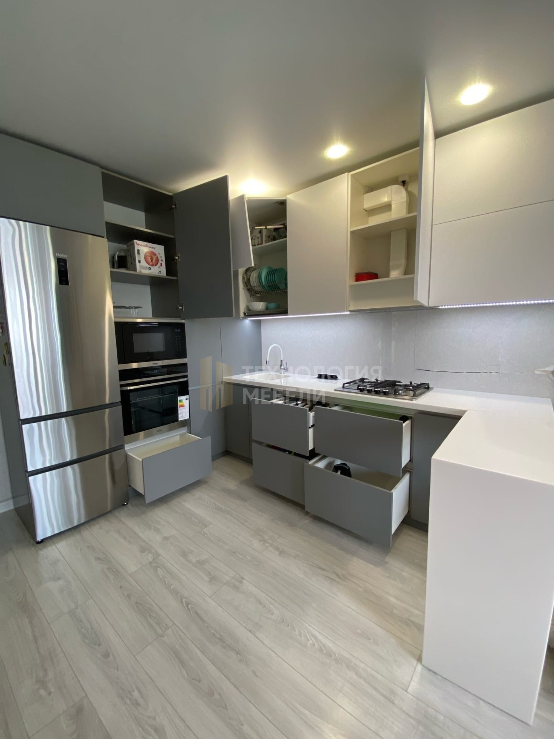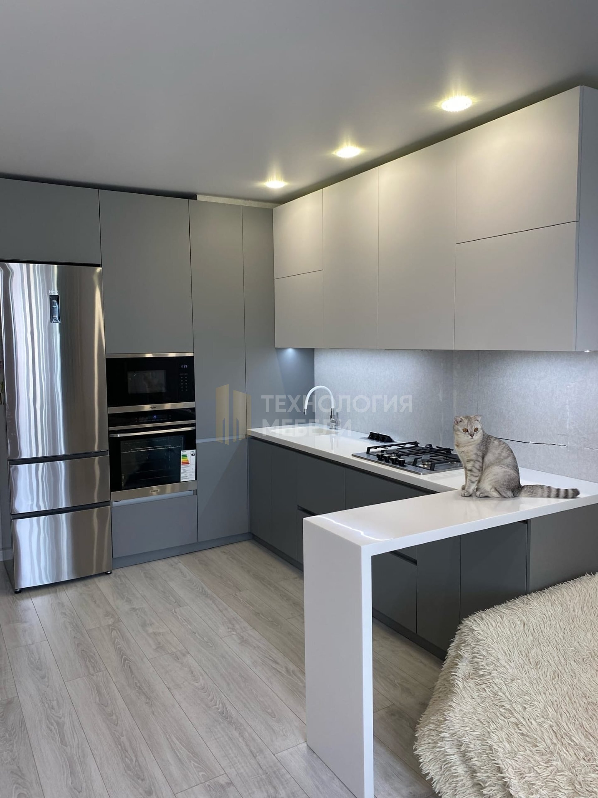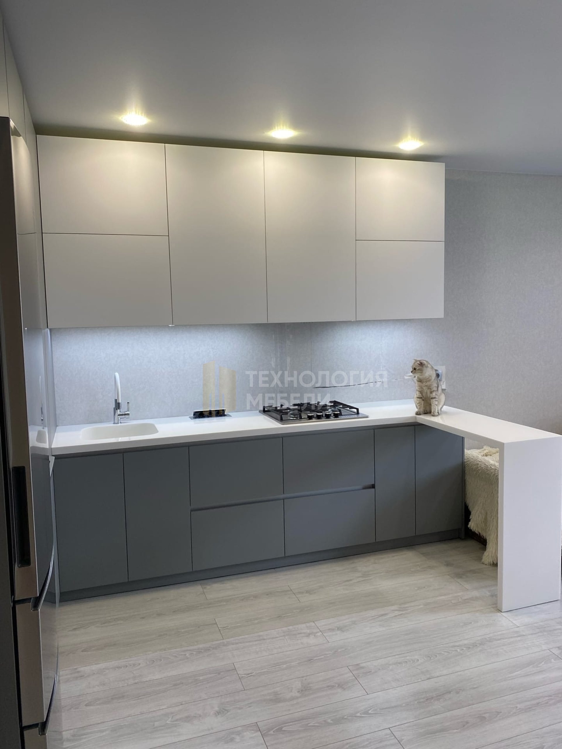 Этот кухонный гарнитур в лаконичном современном стиле станет идеальным решением для организации пространства на вашей кухне. Спокойный серый цвет фасадов создает атмосферу уюта и чистоты, а глянцевая поверхность добавляет элегантности и визуально расширяет помещение. Прямые линии и минималистичный дизайн гармонично впишутся в интерьер любой планировки, будь то небольшая кухня в квартире или просторное помещение в загородном доме. Комплектация включает в себя как напольные, так и навесные шкафы, что позволяет максимально эффективно использовать каждый сантиметр пространства. Светлая столешница контрастирует с темными фасадами, подчеркивая четкость форм и создавая сбалансированный образ. Подсветка рабочей зоны обеспечивает комфортное приготовление пищи и добавляет функциональности. Гарнитур продуман до мелочей, предлагая удобное хранение для посуды, кухонной утвари и продуктов. Изготовление мебели осуществляется с применением современных технологий, в том числе на производственных мощностях завода «Технология мебели» в Санкт-Петербурге, что гарантирует высокое качество и надежность конструкции. Этот кухонный гарнитур – это не просто мебель, это инвестиция в комфорт и функциональность вашего дома, создающая пространство, где приятно готовить и проводить время с семьей. Светлые оттенки и продуманная организация пространства делают кухню визуально более просторной и светлой, а современный дизайн подчеркнет ваш безупречный вкус.