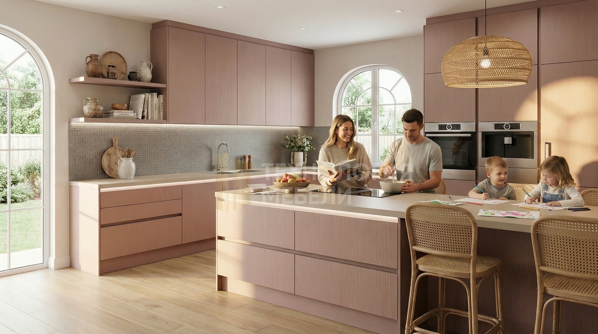 Представляем угловую кухню длиной 3.6 м, сочетающую стили модерн, ротанг и неоклассика. В ее дизайне использованы дерево, массив дерева, МДФ, ткань, а также оттенки белого и белой эмали. Фасады фрезерованные из ЛДСП цвета пыльной розы с древесной фактурой. Корпус из влагостойкого ЛДСП светло-серого цвета. Столешница из МДФ со шпоном, матовая, бежевого цвета. Фартук выполнен из мозаики, серый матовый. Отсутствие ручек, тип открывания – интегрированный профиль, что подчеркивает минимализм. Верхние модули до потолка, открытые полки не предусмотрены. Кухня оснащена функциональным островом. Подсветка рабочей зоны отсутствует, однако система освещения соответствует типу LED.