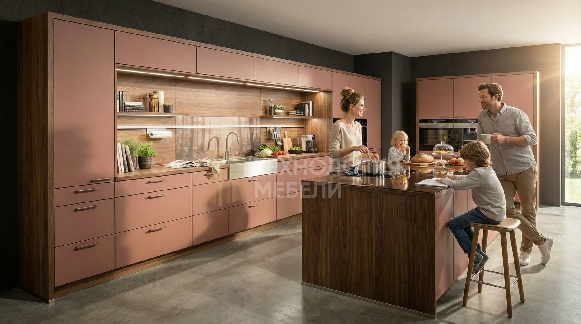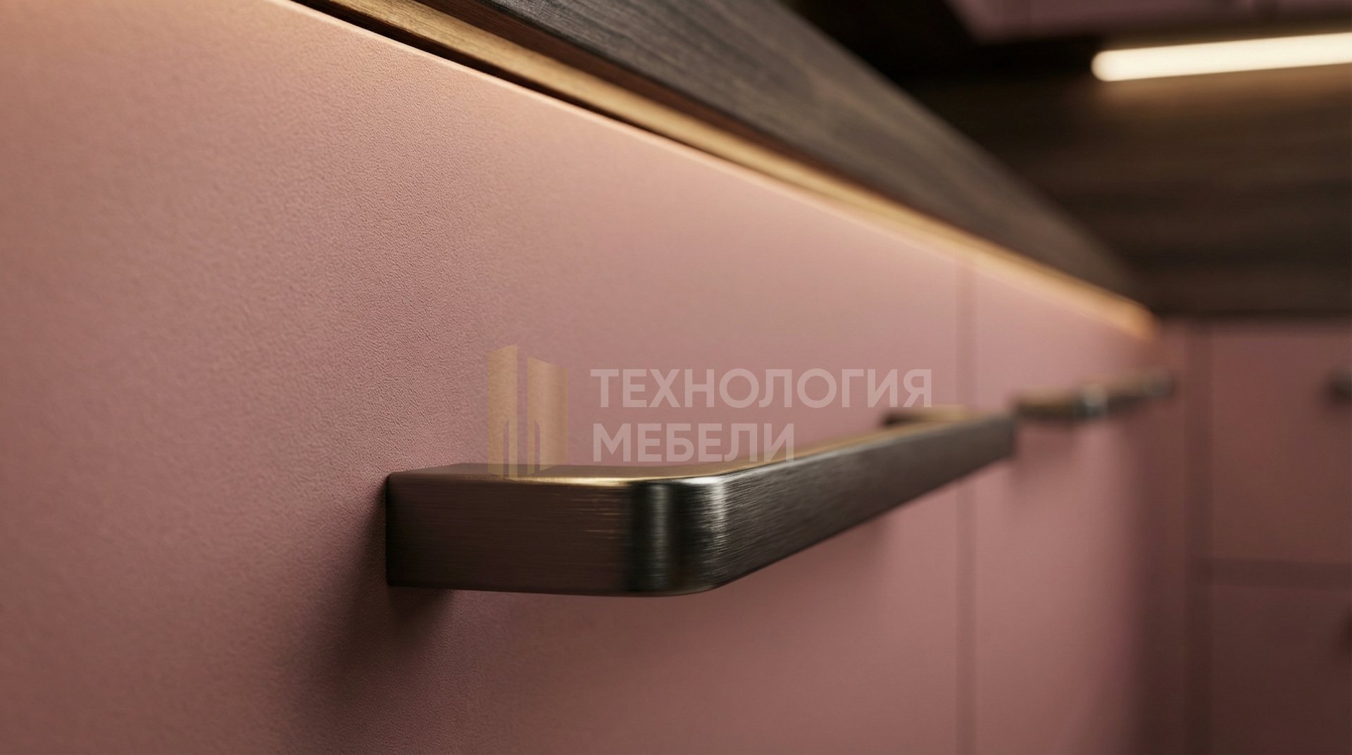 Встроенная кухня «Розалин» прямой формы (2.4 м) – элегантное решение с матовыми плоскими фасадами из шпона "пыльная роза". Корпус из влагостойкого ЛДСП "тёплый орех" и матовая стеклянная столешница "тёмный орех" создают гармоничный ансамбль. В производстве применены ДСП, стекло, пластик, лак/эмаль, компакт-ламинат (HPL). Кухня оснащена выдвижными ящиками и не имеет ручек, подчеркивая минимализм. Верхние модули до потолка обеспечивают максимум хранения. Фартук – панель МДФ под дерево с фотопечатью. В комплектацию входит кухонный остров. Открытых полок нет, что сохраняет чистоту линий. Подсветка реализована накладными профилями.