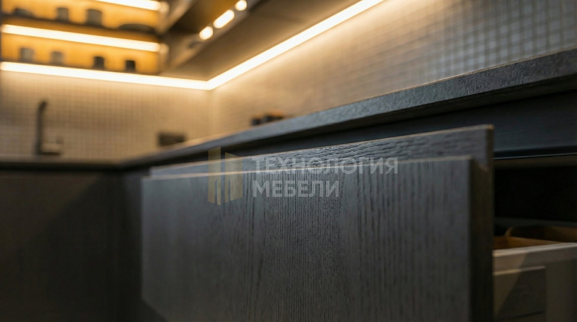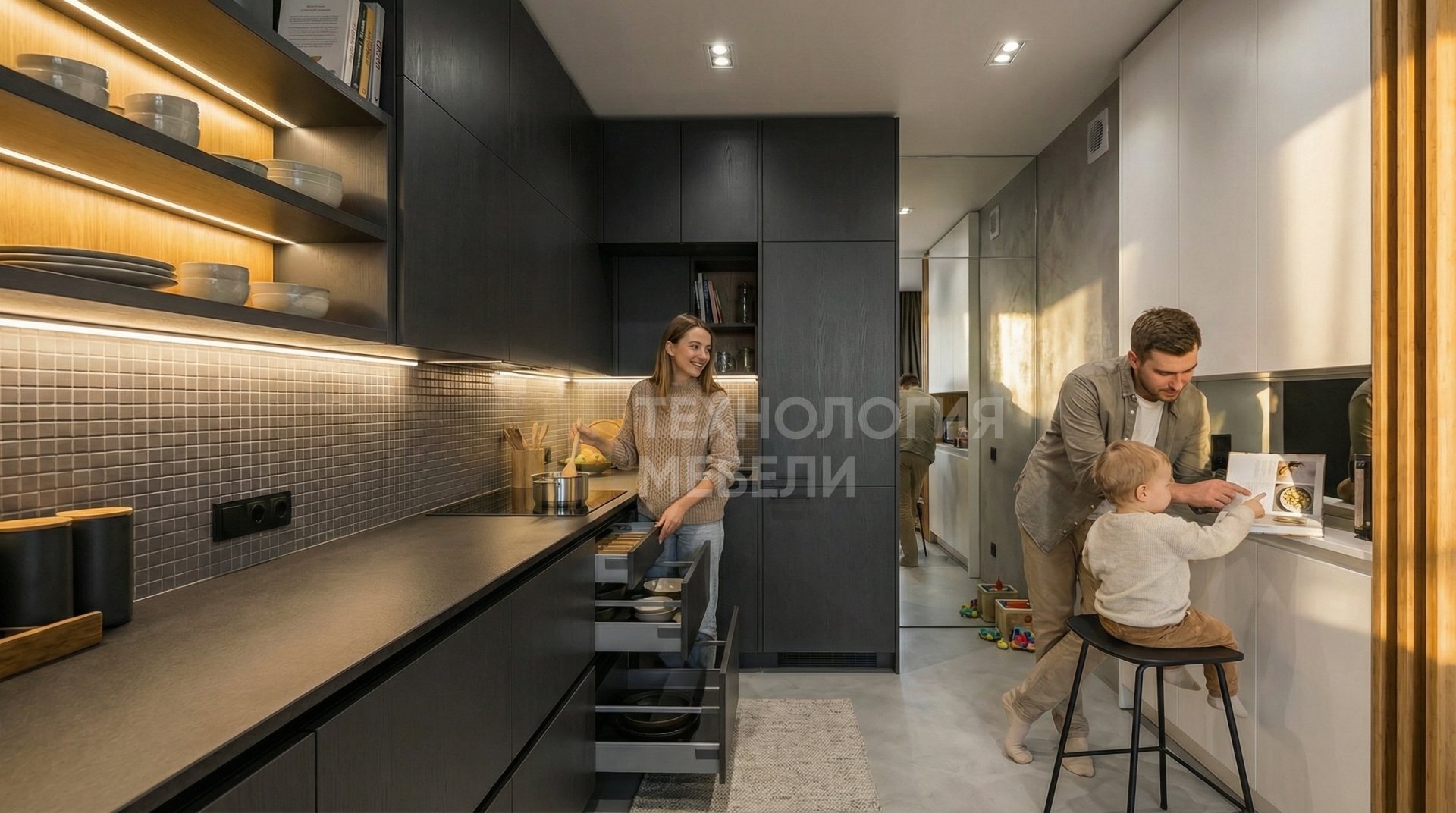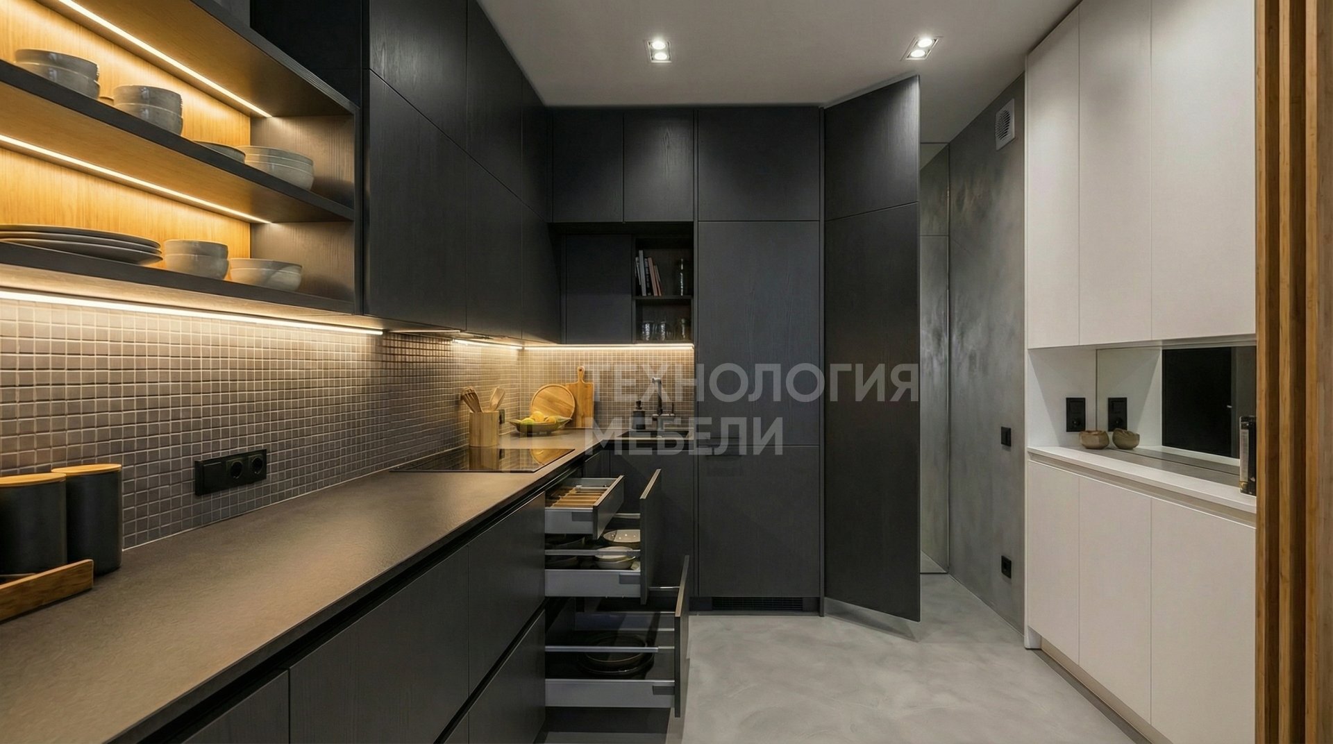 Представляем кухню Стелларис — воплощение стиля хай-тек и передовых технологий. Длиной 1.8 м, спроектирована без кухонного острова, она идеально вписывается в современное пространство. Рамочные фасады из эмали цвета графит с древесной фактурой, без ручек, создают эффект цельной гладкой поверхности, подчеркивая минимализм. Корпус из ЛДСП Kronospan белого цвета обеспечивает надежность и долговечность конструкции. Матовая столешница из искусственного камня антрацитового оттенка гармонично дополняется фартуком из мозаики серого матового цвета. Верхние модули до потолка и открытые полки максимально используют пространство, предлагая эффективные решения для хранения. Рабочая зона оснащена яркими точечными светильниками. Удобство обеспечивается плавными выдвижными ящиками. В дизайне гармонично сочетаются антрацит, графит, белый и серый матовый, которые могут быть подчеркнуты элементами из ткани, бамбука, композитных материалов, микроцемента и зеркальных панелей, создавая уникальный, современный и функциональный интерьер.