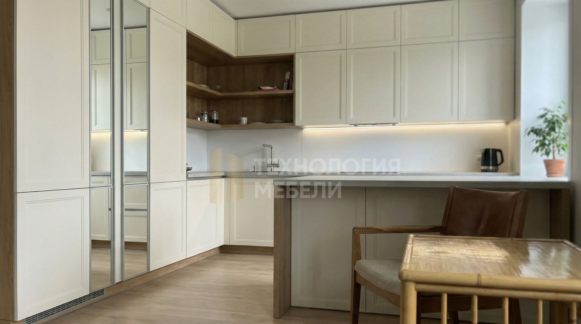 Модульная угловая кухня Ваниль-Грейс длиной 2.4 м – воплощение современного стиля и функциональности. Фасады цвета Молочный ваниль, выполненные в рамочном типе с гладкой фактурой, изящно дополнены вставками из Зеркала серебро, создавая игру света и пространства. Безупречный и лаконичный облик достигается благодаря отсутствию ручек и интегрированному профилю открывания. Корпус из МДФ в оттенке Дуб вотан гармонично контрастирует со светло-серой столешницей из МДФ со шпоном, фактура которой приятно текстурирована. Белый фартук из МДФ-панели добавляет чистоты. Продуманный дизайн включает кухонный остров, вместительные верхние модули до потолка и открытые полки для декора и удобства. Общее освещение кухни реализовано с помощью светодиодной ленты, подчеркивающей каждый элемент.