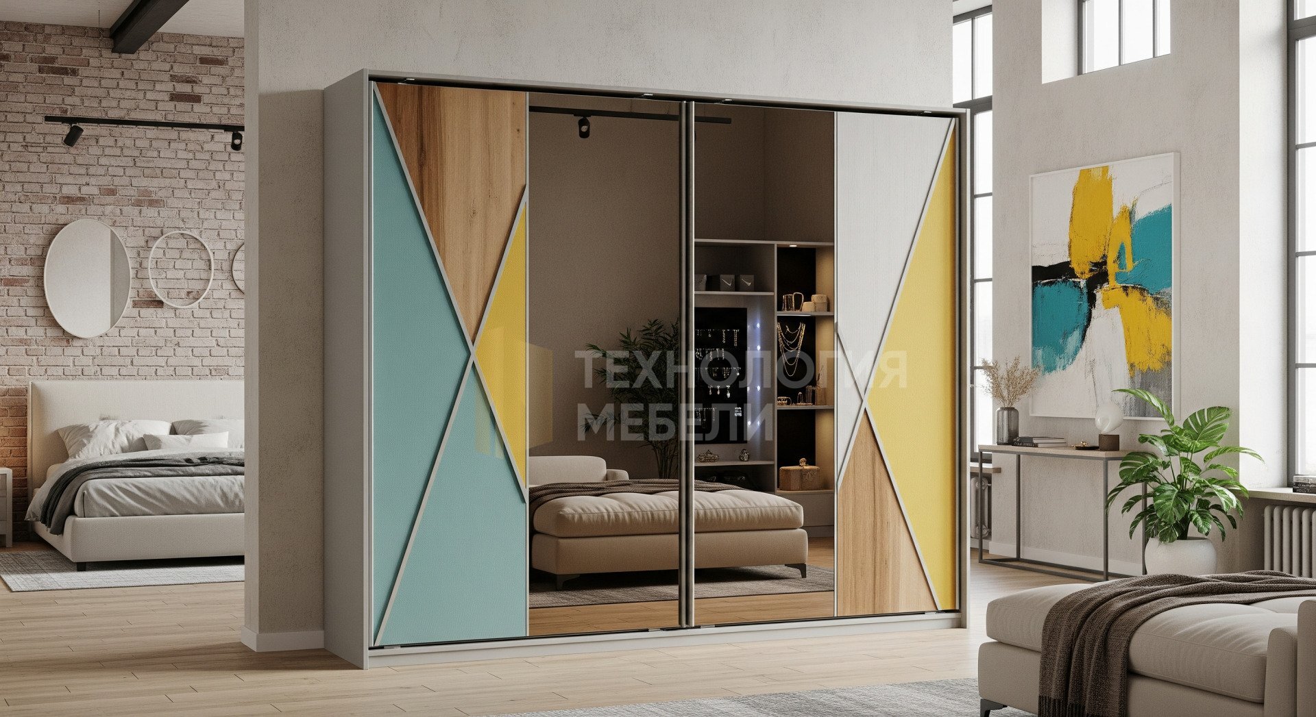 Шкаф-купе "Велана". Стиль: Модерн, Прованс, Лофт. Корпус: ЛДСП Kronospan 18мм, корпусный. 4 диагональные двери (трапеция) с верхнеподвесной системой, доводчиками. Профиль: широкий классический, матовое серебро. Фасады: зеркало графит/бронза, ткань, декор под дерево (МДФ/HPL). Цвета: бирюзовый, желтый, светлый дуб, светлый камень, тёплый орех. Внутри: полки, торцевые вешала-микролифты, подсветка. Глубина 600мм. Без ящиков. Органайзер для украшений. Кромка ПВХ 2мм. Задняя стенка: белый оргалит.