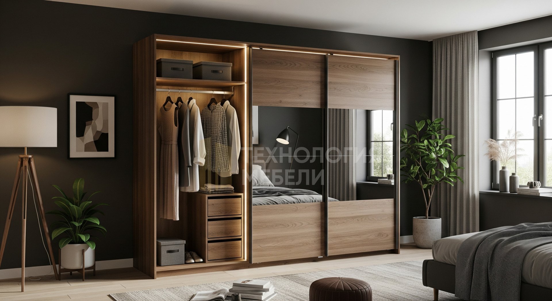 Представляем шкаф-купе 'Веланто' – идеальное решение для ценителей функциональности и безупречного стиля, выполненное в эстетике современного модерна. Этот корпусный шкаф-купе, с его продуманным дизайном, станет центральным элементом вашей спальни или прихожей, гармонично вписываясь в любое пространство благодаря раздвижным дверям, экономящим место. Корпус шкафа изготовлен из высококачественной ЛДСП тёпло-коричневого цвета с матовой фактурой, что придаёт ему солидный и уютный вид. Двери из МДФ в оттенке тёмного ореха, также с матовой фактурой, создают элегантный контраст и подчеркивают изысканность модели. Алюминиевый профиль дверей, выполненный в цвете тёмного алюминия, обеспечивает надёжность конструкции и добавляет современную графичность. Особое внимание уделено деталям: встроенная LED-подсветка мягко освещает внутреннее пространство, делая использование шкафа ещё более комфортным. Единичный зеркальный элемент — полноразмерное полотно без фацета — не только функционален, но и визуально расширяет помещение, добавляя света и глубины. Внутреннее наполнение шкафа продумано до мелочей и включает в себя как вместительные полки, так и удобные штанги для одежды, обеспечивая идеальный порядок и лёгкий доступ ко всему необходимому. 'Веланто' — это не просто шкаф, это инвестиция в комфорт и красоту вашего дома, выполненная в роскошной палитре тёмно-коричневого, графита и тёмного ореха.