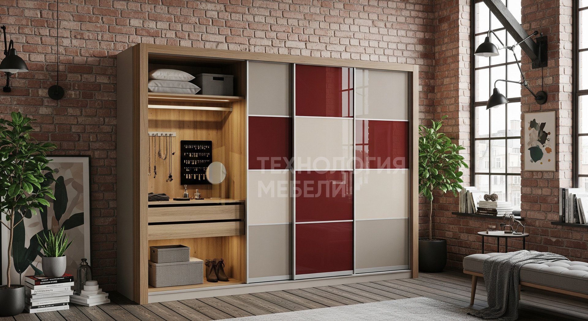 Модульный шкаф-купе. Стиль лофт. Глубокий (>700 мм), встроенный. Корпус: ЛДСП Kronospan 16 мм, ХДФ в цвет, кромка ПВХ 2 мм. Фасад: матовое стекло Лакобель, квадратный профиль в цвет дерева. Цвета: слоновая кость, красный бордовый, теплый бежево-серый, теплый орех, ткань. 2 двери, алюминиевая нижнеопорная система (стопора). Наполнение под заказ (ящики, корзины, брючницы), продольная штанга, органайзер для украшений, подсветка полок.