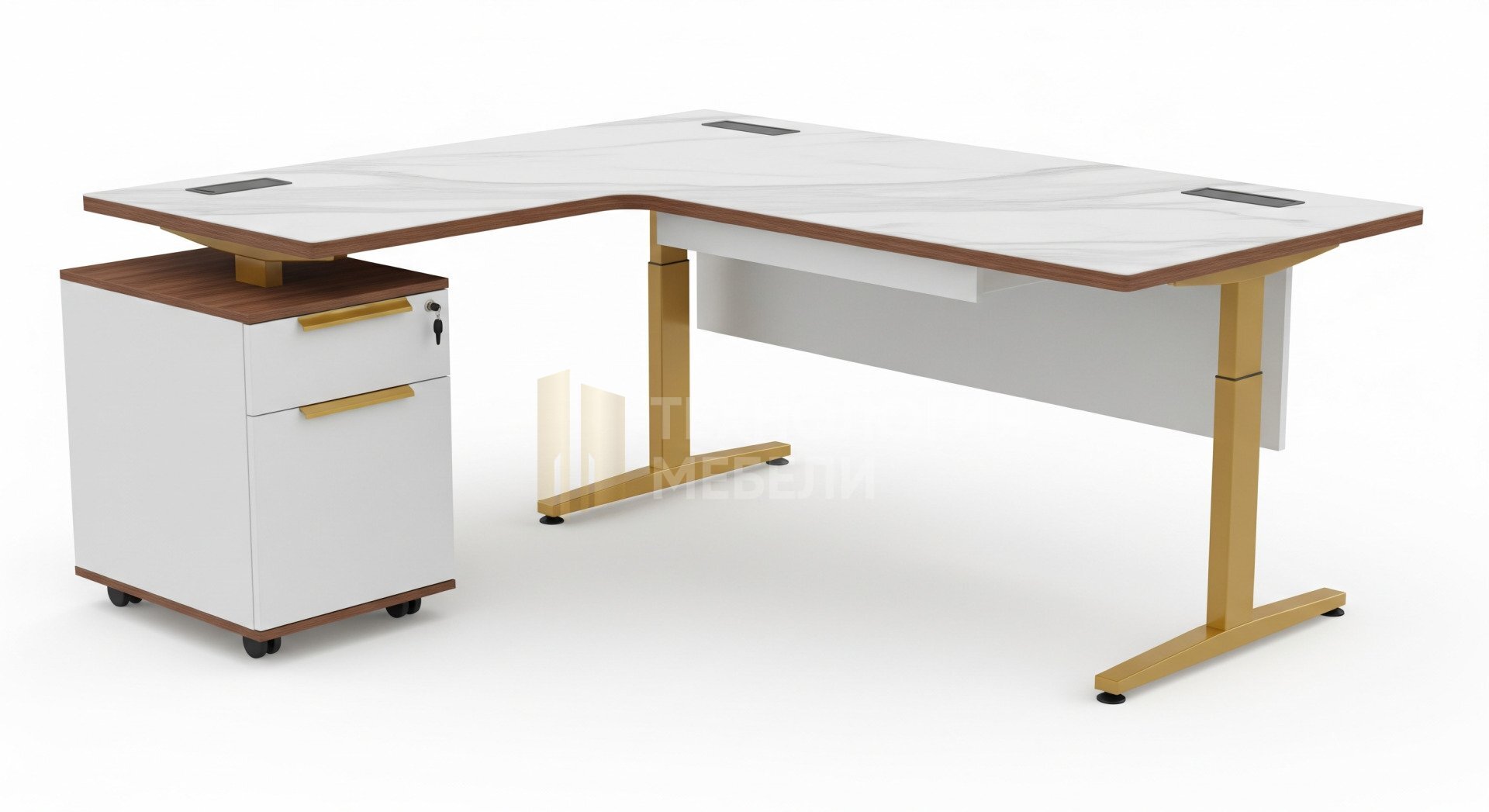 Стол Веларис: офисный журнальный стол (75 см), на колесиках. L-образная столешница из керамики (мрамор), HPL пластик, 25 мм, фаска 45°. Монолитная конструкция: Т-образные золотые мет. опоры (порошковая покраска), царга. 1 ящик. До 50 кг. Стиль: классика, модерн, лофт с тканью. Цвета: белый, орех, молочный ваниль, золотой.
