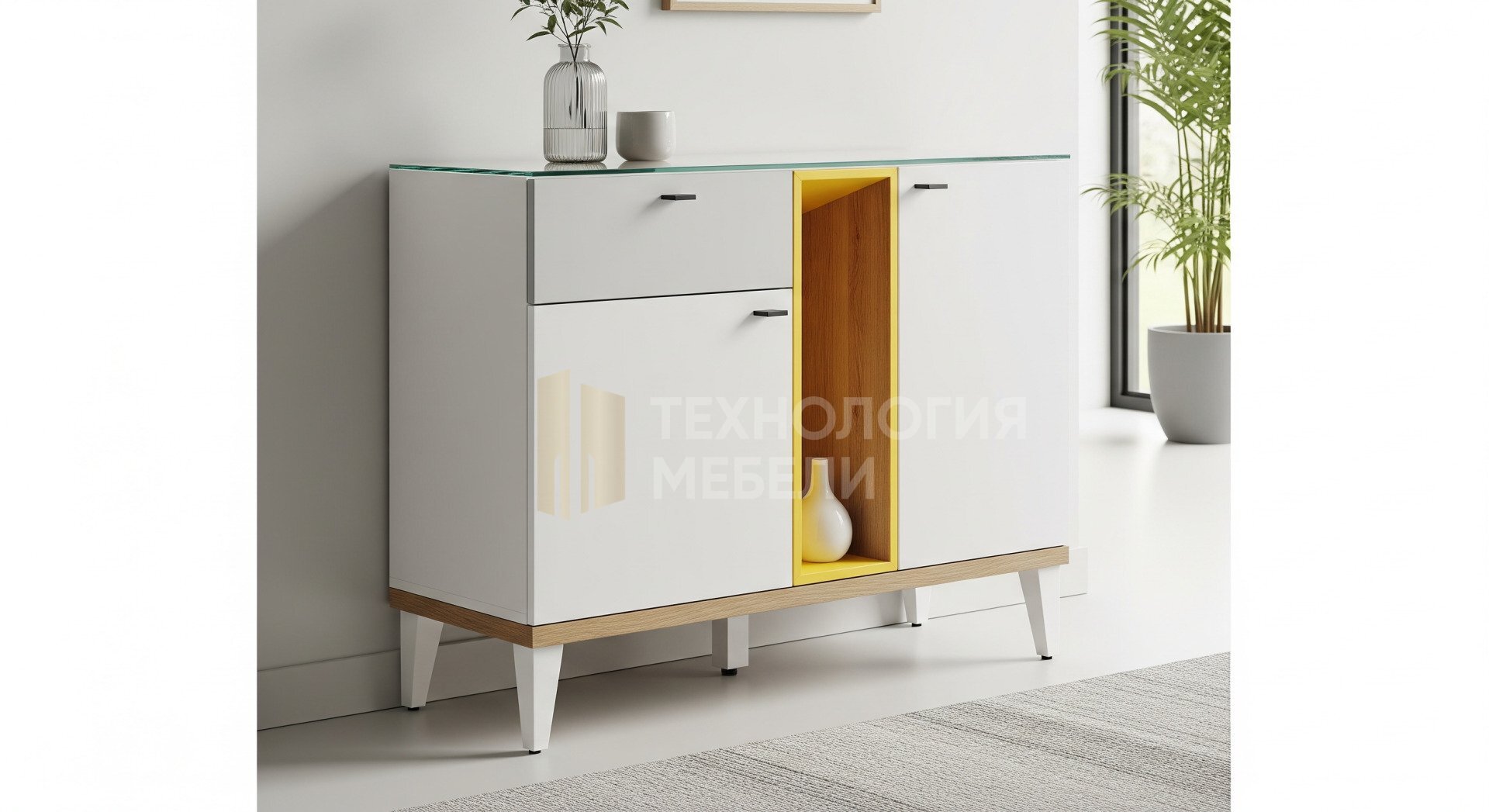 Комод Веллум: современный эко-стиль для спальни и гостиной. Корпус ЛДСП Egger белого цвета. Фасад — зеркальное полотно, столешница — стекло. Один ящик с Push-to-open Blum обеспечивает бесшумное открытие. Узкий (до 30 см), на колесиках для мобильности. Есть открытая ниша. Декоративные ножки 20 см. Сочетает функциональность и эстетику, идеально вписываясь в любое пространство.