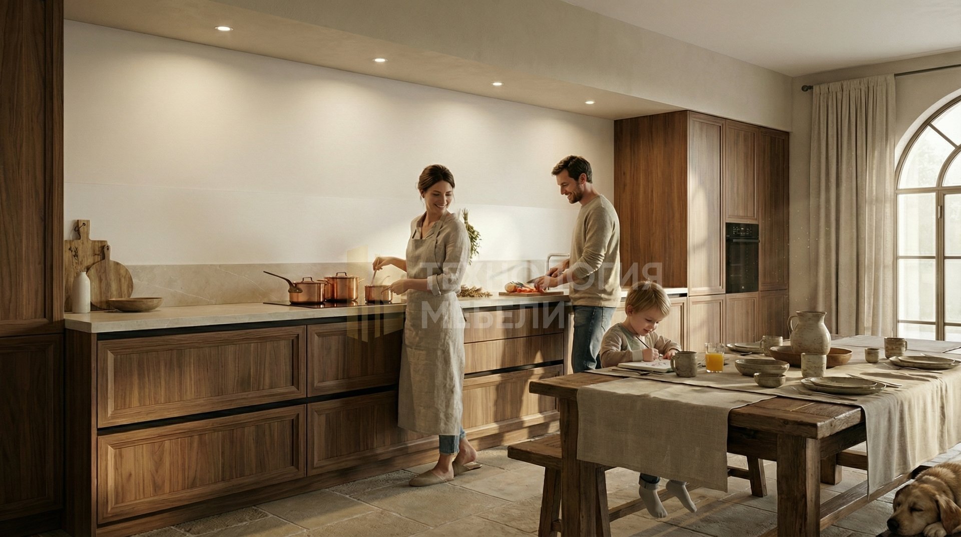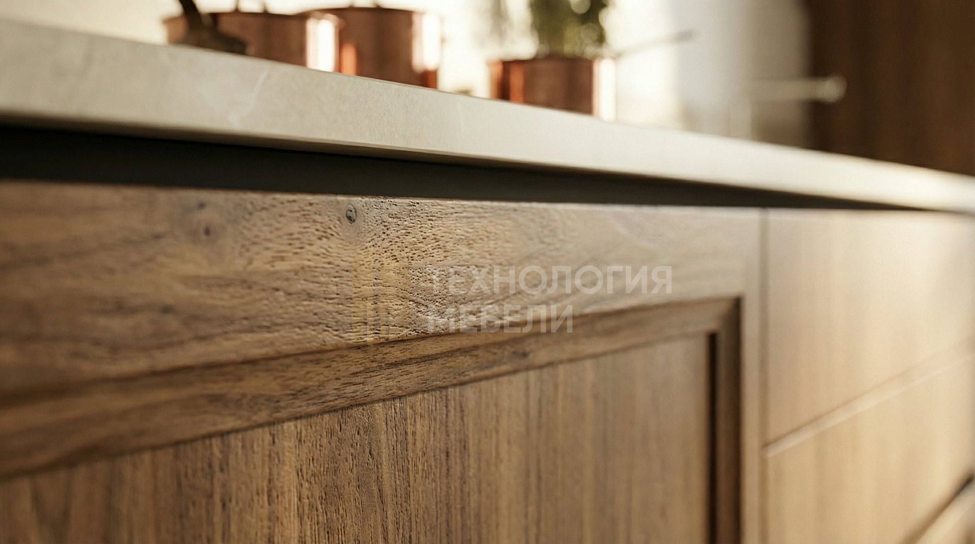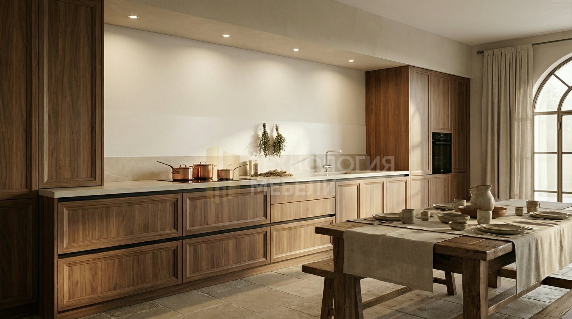 Кухня длиной 3.0 м в стиле Прованс. Корпус из МДФ цвета тёплый орех прекрасно гармонирует с фрезерованными глянцевыми фасадами из ЛДСП оттенка натуральный орех. Столешница из акрилового камня имеет глянцевую фактуру и цвет светлый камень с минимальной текстурой. Белый МДФ-фартук завершает образ. Отсутствие верхних модулей и открытых полок придает пространству лёгкость. Ручки выполнены в виде интегрированного профиля Gola, обеспечивая удобное открывание выдвижных ящиков. Подсветка рабочей зоны не предусмотрена, но для общего освещения можно использовать точечные светильники. Кухня выполнена без острова. Основные материалы: ЛДСП, МДФ, акриловый камень.