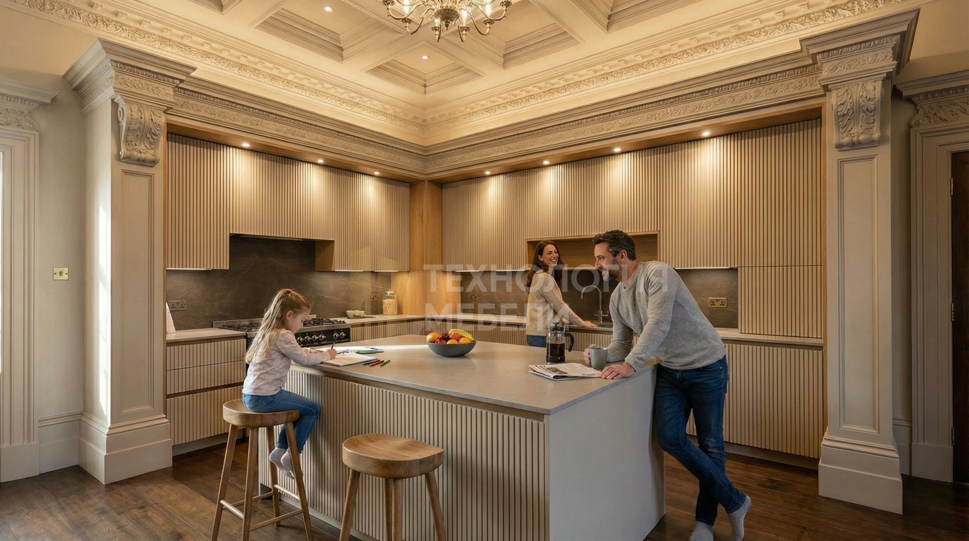 Представляем кухню 'Версаль', воплощение роскошного стиля барокко. Эта Г-образная кухня длиной 4.2 м выполнена из влагостойкого ДСП цвета Дуб вотан для корпуса, подчеркивая прочность и долговечность. Фасады из МДФ с реечной матовой фактурой в нежном оттенке Кашемир оснащены системой Push-to-open для бесшумного распашного открывания. Отсутствие верхних модулей и открытых полок придает пространству легкость. Столешница из искусственного камня светло-серого цвета имеет матовую фактуру, гармонируя с фартуком из керамогранита в цвете Тёмный орех. Функциональность дополнена точечной подсветкой рабочей зоны и просторным кухонным островом. В дизайне использованы ЛДСП, кожа, бамбук и керамогранит, создавая неповторимый интерьер.