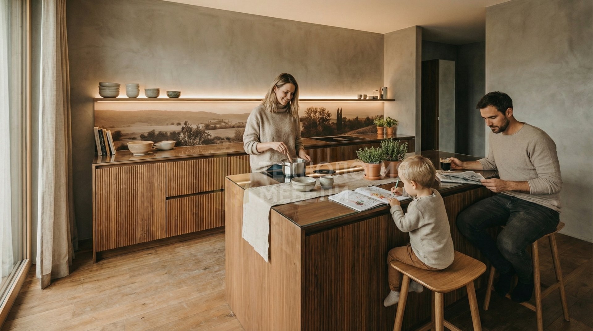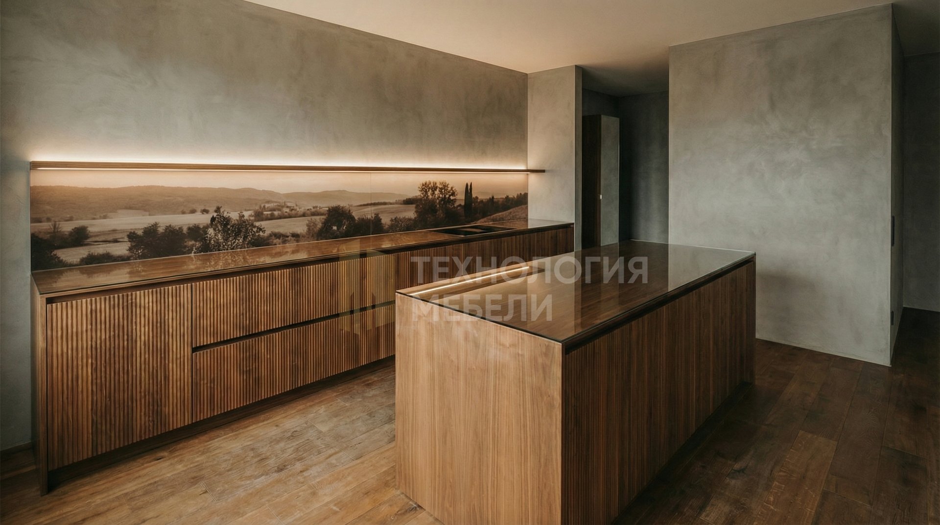 Эта классическая кухня длиной 2.4 м предлагает идеальный баланс стиля и функциональности. Корпус из ЛДСП белого цвета дополнен фасадами из шпона натурального ореха, имеющими плоский тип и фрезерованную вертикальную фактуру. Столешница из стекла цвета натурального ореха обладает глянцевой фактурой. Фартук, выполненный из МДФ-панели, украшен фотопечатью. В производстве использованы пластик и микроцемент. Открывание осуществляется посредством выдвижных ящиков с системой Push-to-open, что позволяет отказаться от ручек. Кухня прямой формы, с кухонным островом. Отсутствуют верхние модули и открытые полки, что придает современный минималистичный вид. Присутствует LED подсветка, добавляющая изысканности.