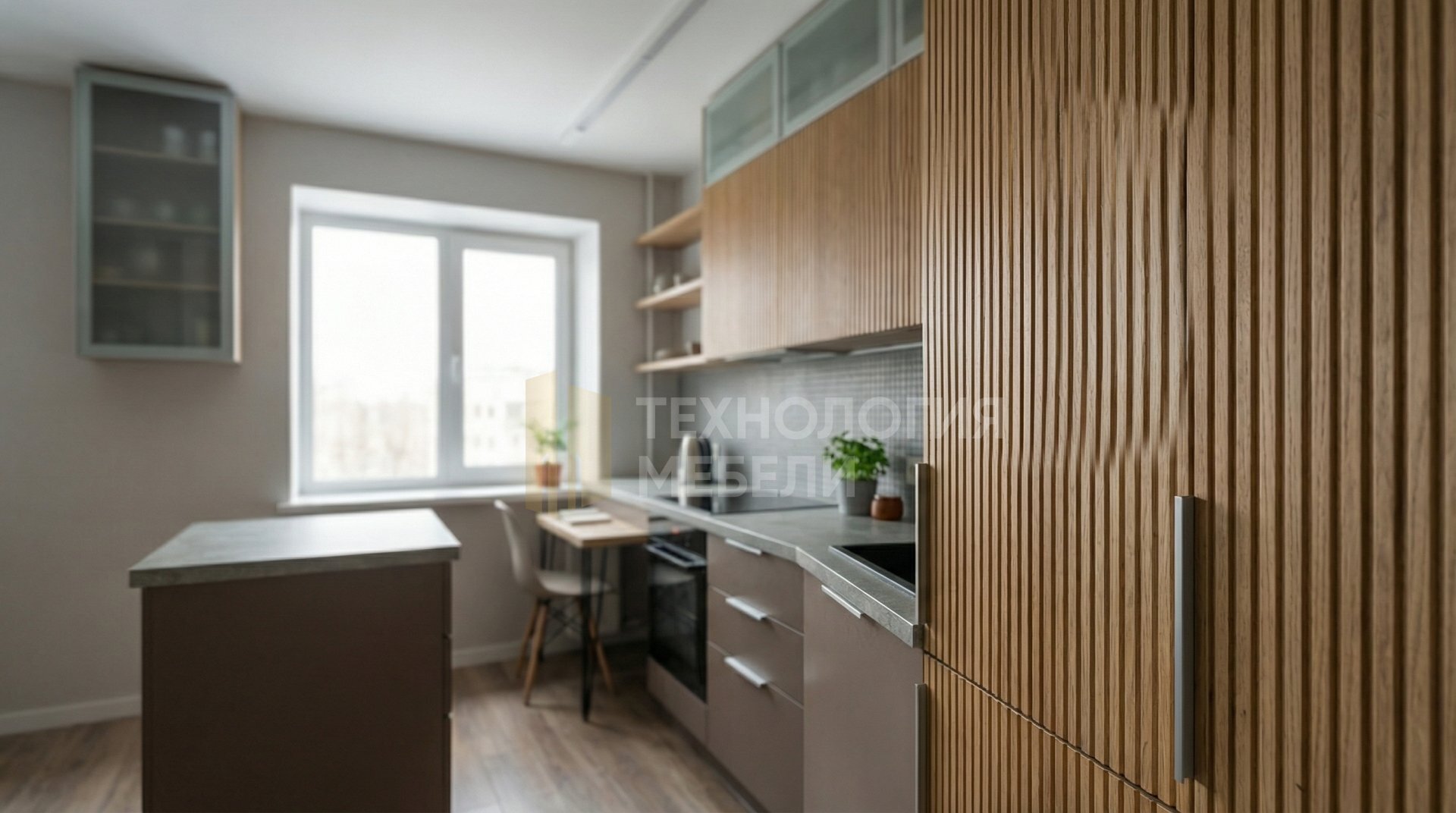 Угловая кухня "Вертикаль" в стиле ротанг предлагает функциональность и эстетику. Корпус выполнен из ЛДСП Kronospan коричневого цвета. Фасады из стекла Лакобель цвета натуральное дерево имеют фрезерованный тип и вертикальную фактуру. Ручки интегрированы в фасад посредством профиля Gola. Столешница из закаленного стекла представлена в цвете бетон и обладает текстурированной фактурой. Фартук из мозаики выполнен в сером матовом цвете. Верхние модули достигают потолка, дополнены открытыми полками. Общая длина кухни составляет 1.2 м. В комплектацию входит кухонный остров. Тип открывания фасадов - подъемный механизм. Подсветка реализована накладными профилями, при этом подсветка рабочей зоны отсутствует. Основные материалы: массив дерева, ЛДСП, камень, зеркальные панели. Цветовая гамма включает: коричневый, бетон, серый матовый, натуральное дерево.