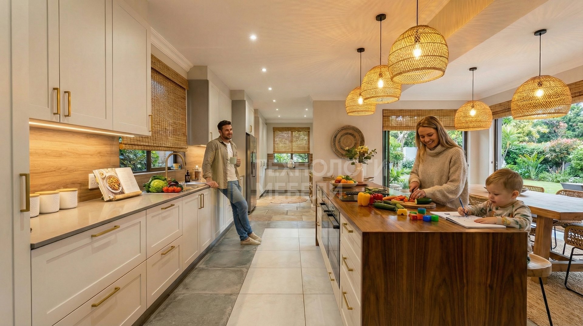 Представляем элегантную кухню в стиле Ротанг. Корпус выполнен из ЛДСП Egger в сером цвете. Фрезерованные матовые фасады из МДФ с премиум-декором под натуральное дерево, окрашенные в белый цвет, создают изысканный вид. Столешница из массива с влагостойкой обработкой имеет глянцевую фактуру и насыщенный цвет ореха. Фартук из МДФ-панели имитирует натуральное дерево, дополняя общий дизайн. Удобные накладные ручки и выдвижной тип открывания обеспечивают комфорт использования. Рабочая зона оснащена светодиодной подсветкой. Открытые полки отсутствуют, верхние модули стандартной высоты. Длина кухни составляет более 4.5 метров, что идеально подходит для просторных помещений. В дизайне использованы элементы из дерева, бамбука, камня и керамогранита. Кухонный остров отсутствует.