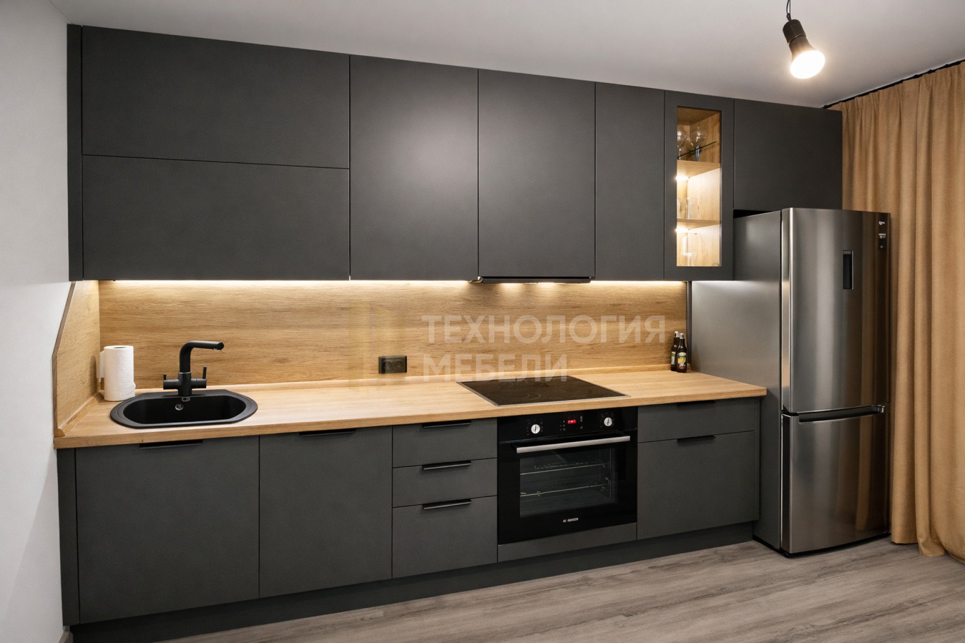 Кухня «Викинг» — стильная и функциональная модель в современном минималистичном исполнении. Глубокий графитовый оттенок фасадов в сочетании с теплой древесной текстурой столешницы и фартука создает выразительный контраст и придает интерьеру характер, строгость и уют одновременно. Лаконичные матовые фасады формируют цельную и аккуратную композицию, подчеркивая современную эстетику кухни. Верхний ряд шкафов обеспечивает удобную систему хранения, а встроенная подсветка рабочей зоны делает процесс приготовления максимально комфортным. Элегантная витрина со стеклом и подсветкой добавляет интерьеру легкости и служит декоративным акцентом. Продуманная эргономика кухни позволяет удобно организовать рабочее пространство: зона мойки, приготовления и хранения расположены компактно и функционально. Просторная столешница с практичным покрытием устойчива к ежедневным нагрузкам и сохраняет привлекательный внешний вид на долгие годы. Кухня «Викинг» отлично подойдет для современных квартир и студий, где ценятся строгий дизайн, практичность и продуманная организация пространства. Особенности модели: современные матовые фасады графитового цвета контрастная столешница и фартук с древесной текстурой встроенная подсветка рабочей зоны декоративная витрина со стеклом и подсветкой удобная система хранения лаконичный современный дизайн