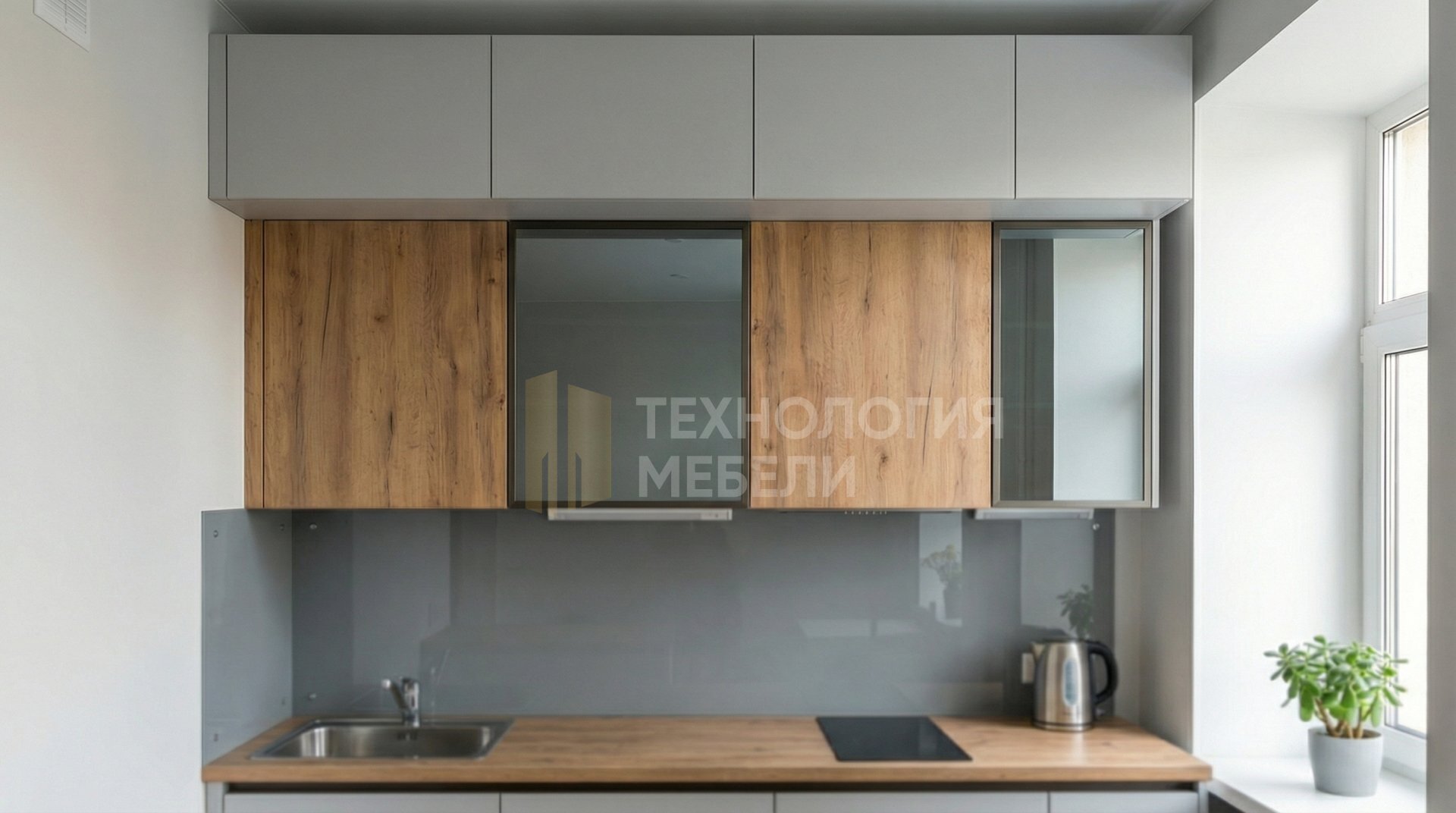 Кухня в стиле Лофт. Корпус выполнен из ЛДСП Egger в светло-сером цвете. Фасады цвета Дуб вотан имеют гладкую фактуру и выполнены с использованием зеркала и стекла в профиле. Столешница из ЛДСП также цвета Дуб вотан, матовая. Фартук из закаленного стекла, серый матовый. Длина кухни 1.2 метра, форма прямая. Отсутствие ручек реализовано системой Push-to-open. Тип открывания – выдвижной. Кухонный остров предусмотрен. Верхние модули стандартной высоты, открытых полок нет. Подсветка рабочей зоны отсутствует, но есть накладные профили. Используемые материалы: МДФ, ДСП, Металл, Кожа, Микроцемент. Основные цвета: светло-серый, серый матовый, дуб вотан.