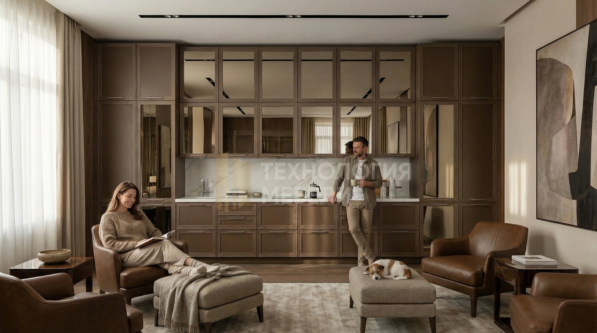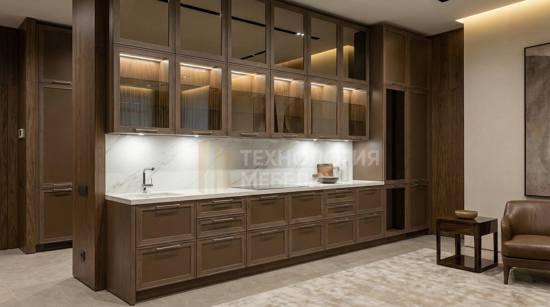 Эта встроенная кухня длиной 4.2 метра гармонично сочетает функциональность и эстетику. Фасады рамочного типа из стекла Лакобель с зеркальным полотном и древесной фактурой устремлены до потолка, создавая единое пространство без открытых полок. Корпус выполнен из металла коричневого цвета. Столешница из HPL-пластика с текстурированной поверхностью имитирует белый мрамор, а фартук из белого керамогранита дополняет образ. Рабочая зона оснащена точечными светильниками. Открывание осуществляется выдвижными ящиками с ручками-скобами. В дизайне использованы кожа, ткань и лак/эмаль, подчеркивая роскошь и стиль. Кухонный остров отсутствует, сохраняя прямую форму кухни.